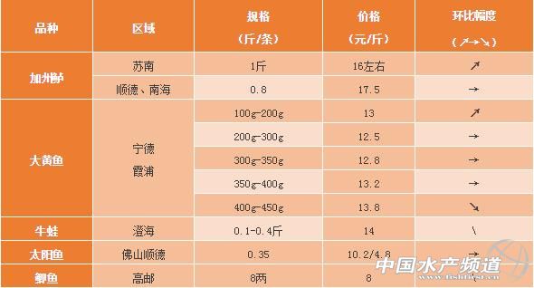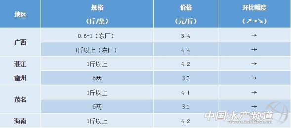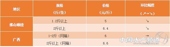 文/圖 粵海飼料集團 水產(chǎn)前沿 吳佳輝 羅氏沼蝦 肇慶金渡白土區(qū)域:目前放苗情況總體比晚年低,主要養(yǎng)春節(jié)蝦居多,根據(jù)春節(jié)時間比晚年推遲20天左右,病害主要高溫應(yīng)激反映強烈為主。 海鱸 福建莆田、東山、詔安區(qū)域:鱸魚養(yǎng)殖存塘魚規(guī)格在1.8斤以上,今年新鱸魚主要規(guī)格在3-5兩,未達規(guī)格上市。銷售活魚主要規(guī)格在1.4-1.8斤規(guī)格,鱸魚仍保持較好的價格。 金鯧魚 廣東湛江區(qū)域:受到廣西、湛江市場行情的影響,陽江地區(qū)的金鯧價格也在下跌。 廣東陽江區(qū)域:魚塘春魚上市,同時網(wǎng)箱養(yǎng)殖方面要騰出網(wǎng)箱給春苗分籠,導(dǎo)致金鯧集中上市,價格走低。 粵東潮汕區(qū)域:市場上無成品魚,無價格參考。 廣西區(qū)域:塘養(yǎng)小規(guī)格金鯧開始上市,過冬魚上市集中,魚價持續(xù)下降,本周活鮮0.8-1斤價格比上周下跌0.3元/斤,0.8-1(凍品)價格與上周持平。凍品魚因庫存量消化緩慢,價格與上周持平:300/400克:9.5元/斤;400/500克:11元/斤;500/600克:12元/斤;600/700克:12.75元/斤;700/800克:13元/斤。 海南區(qū)域:海南的過冬魚已出售完,暫無報價。 生魚 佛山順德區(qū)域:目前存塘量不足1成,主要以秋魚為主,放苗主要朝苗為主,水花較少,部分地區(qū)生魚苗病害急性腸炎、白嘴、爛身為主。 黃顙魚 廣東佛山區(qū)域:目前西樵成魚存塘量不足1成,三水存塘來量2成左右,放苗2成左右,主要放規(guī)格苗為主,7-8月份為主,黃顙魚開始投喂0#料,最近天氣變化大,發(fā)病較多,黃顙魚小魚主要病害以爆頭、出血、指環(huán)蟲多爆發(fā)、藍藻較多;大黃顙魚主要病害以爆頭、腸炎、腹水、出血較多。 浙江區(qū)域:現(xiàn)在出魚較多,價格不是太好,預(yù)計到7-8月份達到最高。 廣西區(qū)域:氣溫高,黃顙魚病害多,廣西以輸出外省為主的黃顙魚價格下滑。 羅非魚 廣西區(qū)域:目前過冬羅非魚市場存量少,新魚尚未能上市,魚量少價漲,0.6-1(凍廠)比上周漲0.2元/斤,1斤以上(凍廠)比上周漲0.1元/斤,走市場的鮮活大羅非價格較好,1.5斤/尾收購價5.5元左右,但走量不多。 草魚 中山區(qū)域:當年魚種即將大量出塘;5斤以上存塘量低價格堅挺;氣溫高,北運減少,超市魚價格小幅下跌。 廣西:近期氣溫高,草魚不耐長途運輸,魚價有小幅下滑,價格比上周略跌0.1元/斤。 上海崇明島:草魚現(xiàn)在是有史以來價格最高的一年,現(xiàn)在草魚也出魚較少,需求量也下降,價格有所下降。 石斑魚 海南區(qū)域:小規(guī)格珍珠斑價格略降,東星斑和大規(guī)格珍珠斑價格略漲,老鼠斑價格持平。 叉尾 廣西區(qū)域:氣溫高,叉尾病害多,病魚拉低一定價格,小規(guī)格叉尾價格與上周持平,2斤以上比上周下跌0.2元/斤。 泥鰍 中山區(qū)域: 目前泥鰍存塘量少,養(yǎng)殖三角居多,現(xiàn)階段主要標苗為主。 其他品種 加州鱸:蘇南區(qū)域鱸魚價格現(xiàn)在有所增加,現(xiàn)在市場需求量加大,及冰鮮價格上漲也有所影響,價格最高應(yīng)該會出現(xiàn)在6月份以后。目前價格在慢慢回升,受南方價格沖擊及出魚量不大。 大黃魚:福建寧德、霞浦區(qū)域大黃魚市場本周相對穩(wěn)定,價格浮動在0.1-0.2元/斤。 牛蛙:澄海區(qū)域新蛙開始上市,上年秋蛙養(yǎng)殖少,牛蛙價格高。 鯽魚:高郵價格有下降趨勢,主要是熱水魚很快就有養(yǎng)殖戶賣魚及大豐區(qū)域病魚沖擊。 【關(guān)鍵字】:水產(chǎn) 水產(chǎn)品價格 水產(chǎn)養(yǎng)殖 |