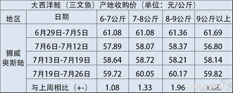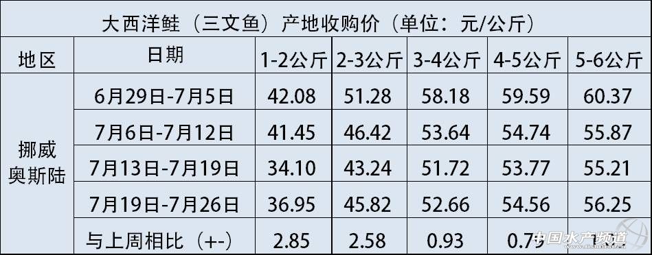 文/圖 海鮮指南(seafood-guide) 陳磊 大西洋鮭(三文魚)產地收購價 注:以上產品均已帶頭去臟包裝完畢,質量等級“優質”,匯率按2017年7月26日計算,1挪威克朗兌換0.8471人民幣 大西洋鮭產地收購平均價 上周(7月20日-7月26日),大西洋鮭產地收購價全線回升,平均價上漲2.51元/公斤。上漲幅度較大的是1-2公斤/條和2-3公斤/條規格的大西洋鮭,這些規格在上個交易日均有較大的降幅,此次回升之后,與前三周的價格相對持平。市場上常見的6-7公斤/條規格的價格也隨著市場的好轉,出現了1.08元/公斤的漲幅,最新的價格為59.72元/公斤,其余各規格的大西洋鮭漲幅也在1元左右。 大西洋鮭(三文魚)產地加工出口價 大西洋鮭新鮮魚產地加工出口價 大西洋鮭凍魚產地加工出口價 在大西洋鮭產地加工出口價方面,大西洋鮭新鮮魚已經保持了三周價格下跌的態勢,目前的價格為每公斤53.81元,此價格為2個月以來最低。同時大西洋鮭凍魚的價格呈現過山車式的變化,上周漲價之后,本周邊出現了價格回落,目前的交易價格為55.14元/公斤,比上周下跌了4.61元/公斤。新鮮魚片和冷凍魚片的價格在上周僅有輕微的變化,較為穩定。預計下周新鮮魚和凍魚的價格都會有上漲的趨勢。 溫馨提示:以上價格行情由“海鮮指南”統計整理發布,僅供參考。市場有風險,交易需謹慎 。 轉載聲明 海鮮指南獨家稿件,如需轉載請注明來源。 |