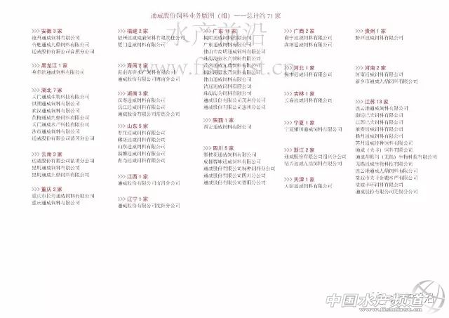 文/圖 水產前沿 唐東東 今天發布通威集團的業務版圖,不梳理不知道,一梳理嚇一跳,通威集團的業務版圖更為龐大,主要可分為三大板塊:一是房地產,二是農牧業,三是新能源;其中房地產業務基本上是通威集團在經營,農牧業和新能源業務主要由通威股份經營。 資料顯示,通威集團由劉漢元及夫人管亞梅共同投資成立,然后通威集團持通威股份52.45%的股份。據筆者粗略統計,截至2017年7月31日通威集團共投資了超250家企業,而從2015年開始,通威股份便在新能源領域發力,短短兩年多時間投資了超過120家企業,成為其最大的亮點。 下面通過7張圖片來向大家呈現: 通威股份飼料版圖(點擊看大圖) 通威集團業務版圖1(點擊看大圖) 通威集團業務版圖2(點擊看大圖) 通威集團業務版圖3(點擊看大圖) 通威集團業務版圖4(點擊看大圖) 通威集團業務版圖5(點擊看大圖) 通威集團業務版圖6(點擊看大圖) 。ㄗⅲ何恼滦畔H供參考,因通威集團的業務板塊龐大,如有遺漏,敬請諒解!) |