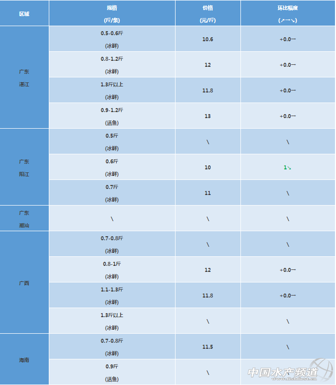 文/圖 粵海飼料集團(tuán) 中國(guó)水產(chǎn)頻道 彭曉君 廣東湛江區(qū)域:本周價(jià)格穩(wěn)定。 廣東陽(yáng)江區(qū)域:陽(yáng)江地區(qū)0.8-1斤的網(wǎng)箱金鯧數(shù)量減少,價(jià)格上升;規(guī)格0.6-0.8斤的塘養(yǎng)金鯧大量上市,價(jià)格略有下跌。 廣東潮汕區(qū)域:市場(chǎng)上無成品魚,無價(jià)格參考。 廣西區(qū)域:本周金鯧魚價(jià)格與上周基本持平,凍品走量低,部分規(guī)格:300/400克比上周下跌0.1元/斤,其它規(guī)格凍品與上周價(jià)格持平。200/300克:8.25元/斤,300/400克:9.2元/斤;400/500克:10.8元/斤;500/600克:11.5元/斤;600/700克:12.5元/斤;700/800克:12.75元/斤。目前鐵山港過冬魚已不足10萬斤。 海南區(qū)域:海南春魚最大規(guī)格已有7兩,大部分在5兩左右;現(xiàn)在已經(jīng)開始出現(xiàn)小瓜蟲,但影響不大。 【關(guān)鍵字】:金鯧魚 金鯧魚價(jià)格 水產(chǎn)養(yǎng)殖 |