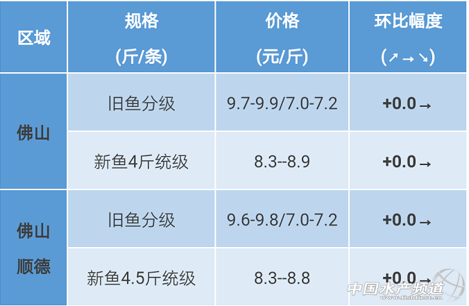 佛山區域:普遍吃生魚4#,5#料為主,價格相對較穩定,秋魚陸續上市;高溫天氣,生魚大魚主要出現腸炎,出血,諾卡氏病,小生魚開始出現季節性腸炎。