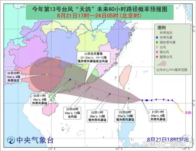 中國水產(chǎn)頻道綜合整理報(bào)道, “天鴿”命名后的VIS動(dòng)態(tài)云圖 今年第13號(hào)臺(tái)風(fēng)“天鴿”早晨8點(diǎn)位于臺(tái)灣鵝鑾鼻東偏南方向約385公里的西北太平洋洋面上,中心附近最大風(fēng)力有8級(jí)(20米/秒,熱帶風(fēng)暴級(jí))。 預(yù)計(jì),“天鴿”將以每小時(shí)15公里左右的速度向西偏北方向移動(dòng),強(qiáng)度逐漸加強(qiáng),最強(qiáng)可達(dá)強(qiáng)熱帶風(fēng)暴級(jí)或臺(tái)風(fēng)級(jí)(25~33米,10~12級(jí));22日下午移入南海東北部海面,并將于23日在廣東沿海登陸(25~30米/秒,10~11級(jí),強(qiáng)熱帶風(fēng)暴級(jí)),然后繼續(xù)向偏西方向移動(dòng),24日減弱后的低壓環(huán)流將進(jìn)入廣西境內(nèi)。中央氣象臺(tái)今晨發(fā)布臺(tái)風(fēng)藍(lán)色預(yù)警。 中央氣象臺(tái)表示,受“天鴿”影響,21日至24日,臺(tái)灣東部洋面和東南部沿海、臺(tái)灣海峽、巴士海峽、南海北部、福建沿海、廣東沿海的風(fēng)力將逐漸加大到7~9級(jí),臺(tái)風(fēng)中心經(jīng)過的海域或地區(qū)有10~12級(jí),陣風(fēng)12~14級(jí)。 22日至24日,臺(tái)灣、廣東、福建南部、浙江、廣西以及湖南南部、貴州東部等地將先后出現(xiàn)大到暴雨,局地大暴雨,部分地區(qū)累計(jì)雨量有100~150毫米,局地雨量可超過200毫米,臺(tái)灣東南部局地雨量可超過300毫米。 另外,今天(21日)開始至23日,西北地區(qū)東部、華北、東北將出現(xiàn)一次明顯降雨過程。陜西、山西、河北、北京、天津等地將先后出現(xiàn)中到大雨,陜西北部、山西中北部等地的部分地區(qū)有暴雨,局地有大暴雨。上述部分地區(qū)并伴有短時(shí)強(qiáng)降水,局地有雷暴大風(fēng)或冰雹等強(qiáng)對(duì)流天氣。 關(guān)于登陸具體地點(diǎn) 當(dāng)然根據(jù)臺(tái)風(fēng)路徑和環(huán)流背景的復(fù)雜性,臺(tái)風(fēng)登陸地帶的預(yù)報(bào)也會(huì)隨時(shí)調(diào)整。雖然,中國的臺(tái)風(fēng)預(yù)報(bào)水平拔高到世界級(jí)了,但是跟地震這種自熱現(xiàn)象一樣,我們無法在提前好幾天就準(zhǔn)確預(yù)報(bào)出了哪個(gè)市哪個(gè)縣甚至哪個(gè)鎮(zhèn)是登陸地點(diǎn);反之,臺(tái)風(fēng)登陸地點(diǎn)還要在臺(tái)風(fēng)登陸之后,根據(jù)各個(gè)區(qū)域氣象站的風(fēng)力、風(fēng)向、氣壓、雷達(dá)和實(shí)景情況來判斷是否真的登陸了。 “天鴿”影響如何? “天鴿”影響如何?這個(gè)的答案也可以給出來。影響大,特別是沿海地區(qū)風(fēng)力會(huì)很強(qiáng)勁,出海的漁船必須回港,海上作業(yè)人員必須提前撤離,漁場(chǎng)養(yǎng)殖業(yè)和沿海旅游景區(qū)可能會(huì)遭受破壞或損失,陸地上主要是強(qiáng)風(fēng)可能破壞建筑設(shè)備、戶外設(shè)施和樹木、園地,暴雨可能引發(fā)的城市內(nèi)澇、山體滑坡、泥石流等災(zāi)害。交通行業(yè)可能也會(huì)受牽連,比如飛行航班的停航、延誤,高鐵動(dòng)車火車的停運(yùn)、延誤,貨運(yùn)、客運(yùn)船的停航,旅游行業(yè)的臨時(shí)變動(dòng)等公共損失。 這些區(qū)域就不局限于登陸地附近了,有時(shí)候臺(tái)風(fēng)影響最嚴(yán)重的不是登陸地,有時(shí)遠(yuǎn)在他鄉(xiāng)幾百公里外的一塊巨大的對(duì)流云產(chǎn)生了強(qiáng)降雨也會(huì)導(dǎo)致民眾措手不及而受災(zāi)。 廣東多地將迎大到暴雨緩解高溫 今天(21日)是出伏的日子,但廣東的朋友這幾天是不是覺得越來越熱? 今天早上沒到8點(diǎn),廣東已有65個(gè)站點(diǎn)掛起了高溫橙色預(yù)警,39個(gè)站點(diǎn)亮高溫黃色預(yù)警。 13號(hào)臺(tái)風(fēng)“天鴿”目前已生成!廣東多地將迎大到暴雨緩解高溫。 但是!臺(tái)風(fēng)來之前,廣東多地還將升溫……今天廣州最高氣溫36℃,明天最高37℃,而本周三,廣州最高溫有望降至32℃。大家是不是盼望臺(tái)風(fēng)很久了? 受臺(tái)風(fēng)“天鴿”影響,預(yù)計(jì)明天(22日)夜間到周四(24日),受臺(tái)風(fēng)環(huán)流直接影響,粵東、珠江三角洲和粵北市縣有大雨到暴雨局部大暴雨,其中粵東、梅州以及河源的部分市縣有暴雨到大暴雨,其余市縣有中雷雨局部暴雨。高溫緩解。 臺(tái)風(fēng)準(zhǔn)備要成串來 小伙伴們,還記得7月下旬的臺(tái)風(fēng)盛世嗎?西北太平洋上,熱帶氣旋曾密集地出生,不過呢,在臺(tái)風(fēng)“海棠”8月1日停編后雖然又有2個(gè)臺(tái)風(fēng)生成,但都對(duì)我國沒影響。 臺(tái)風(fēng)世界仿佛陷入了死寂。 最近,隨著副高又一次西伸北抬,季風(fēng)槽云系出現(xiàn),臺(tái)風(fēng)的又一次活躍期來了! 第一個(gè)出生的就是昨天(20日)生成的13號(hào)臺(tái)風(fēng)“天鴿”(Hato,名字來源于日本,意為天鴿星座) 圖為葵花8號(hào)衛(wèi)星拍攝的紅外云圖 另據(jù)臺(tái)風(fēng)警報(bào)中心判斷:進(jìn)入南海之前可以發(fā)展為熱帶風(fēng)暴以上級(jí)別的臺(tái)風(fēng)并命名(“天鴿”),在副高、西風(fēng)槽混戰(zhàn)中躲過一劫卻錯(cuò)失大好發(fā)展時(shí)機(jī),再進(jìn)入南海靠著高海溫發(fā)展,最高強(qiáng)度可能為強(qiáng)熱帶風(fēng)暴-臺(tái)風(fēng)級(jí)別,最低可能保持著熱帶風(fēng)暴的級(jí)別。路徑上,由于時(shí)間尚早,所以可能的登陸地點(diǎn)囊括了廣東省整
