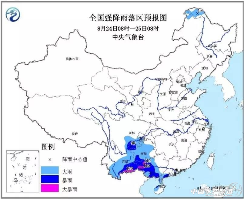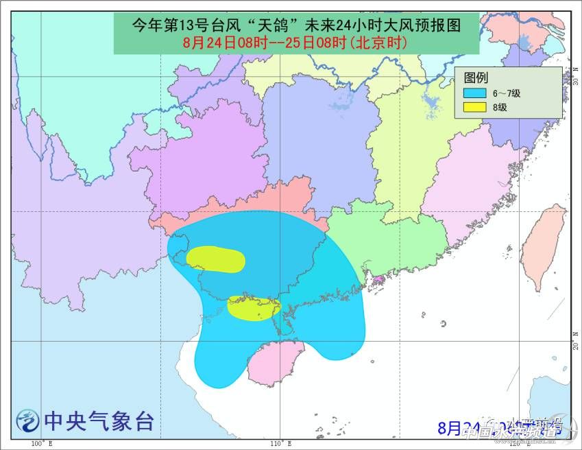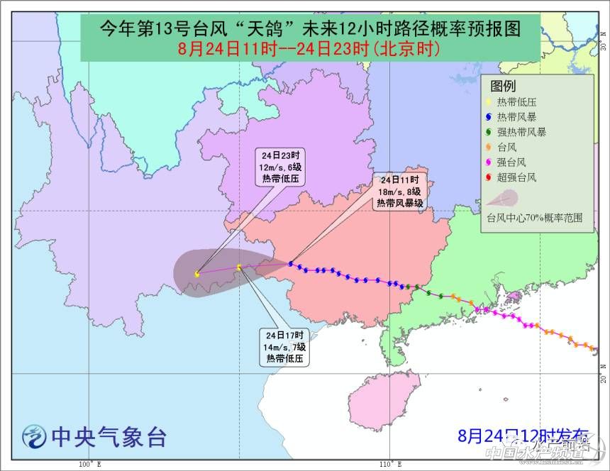 受其影響,24日08時至25日08時,廣東西南部、廣西西部和南部、海南島西北部、云南南部和東部、四川東南部、貴州大部等地有大到暴雨,其中,廣西西部、云南東南部等地的部分地區有大暴雨(100~180毫米),上述大部地區有短時強降水,小時最大降水量50~70毫米。此外,南海西北部、北部灣、廣東西部、海南西北部沿海、廣西大部、云南東部等地將有6-7級大風,其中北部灣北部、廣西西部部分地區的陣風可達8級。中央氣象臺8月24日06時發布臺風藍色預警和暴雨黃色預警。