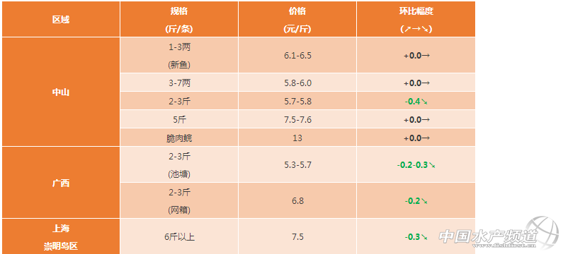 中山區域:當年魚種開始大量出塘,新魚價格高位大幅回落;超市草魚近期市場銷量順暢,價格下跌。新魚上市2-5兩,6.0-6.2元/斤。此次天鴿臺風,中山南(坦洲,神灣,板芙等)靠近珠海一帶災情嚴重,大部魚蝦塘基建被吹塌,中山北好些,養殖戶都在緊張恢復生產。