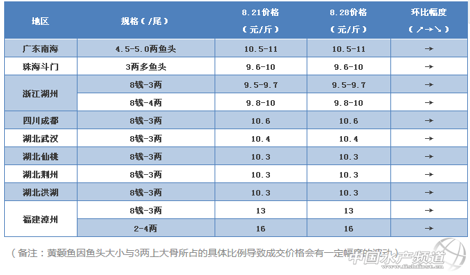 中國水產(chǎn)頻道獨家報道, 文/圖 何氏水產(chǎn)、水產(chǎn)前沿實習(xí)編輯 李靜 黃顙魚 1、本周黃顙魚價格與上周持平,廣東地區(qū)西樵、三水、珠海產(chǎn)區(qū)存塘量越來越少,大規(guī)格存塘量更少,所以大規(guī)格的魚比較緊缺,小規(guī)格貨源暫時比較充足,預(yù)計后期價格不會變化太大,廣東地區(qū)出魚量總體不多。 2、浙江湖洲目前出魚量比較多,能滿足市場需求,價格穩(wěn)定。 |