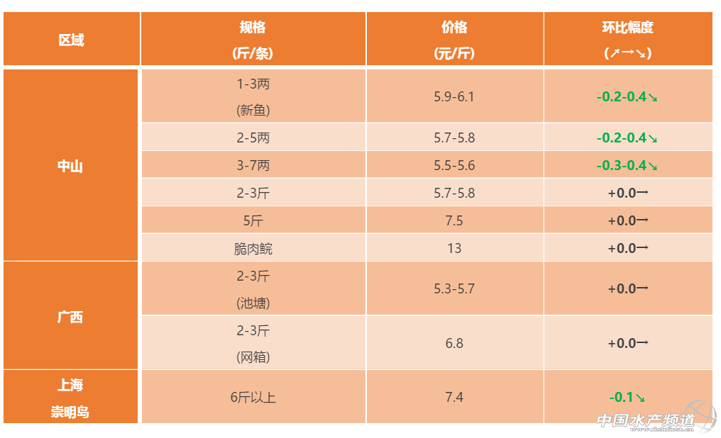中山區域:當年魚種開始大量出塘,新魚價格高位大幅回落;超市草魚近期市場銷量一般,價格下跌;5斤以上存塘量少價格堅挺。