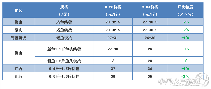 1、本周老魚統貨訂魚價格比上周下跌將近2元/斤,偏大規格訂魚價格30-30.5元/斤,偏小規格訂魚價格則在27元/斤左右,老魚價格跌破成本價,現在出魚的養殖戶大部分都要虧本。偏大規格的魚市場還是比較緊缺,預測后期價格還會有小幅的上漲。上周偏小規格(特別是小標和中標規格)嚴重出現供大于求的情況,導致市場價格一周時間下滑了4元/斤,預測本周供求關系有所緩解,價格后市稍有上漲。 2、現在出塘的新魚魚頭大部分在1.1-1.3斤,1.5斤以上的比較少,新魚主要看魚頭來定價,1.3斤魚頭訂魚價格26元/斤,1.5斤魚頭訂魚價格28元/斤,大魚頭價格比上周又便宜了1-2元/斤,現在新魚吃得好,長得快,再過10多天1.3斤魚頭都會長到1.5斤以上,建議養殖戶把握好賣魚的好時機。 3、廣西、江蘇、湖北、安徽等地老魚存塘量已經不多了,新魚還沒達到上市規格,出塘量很少,與上周相比跌幅在1-3元/斤左右。