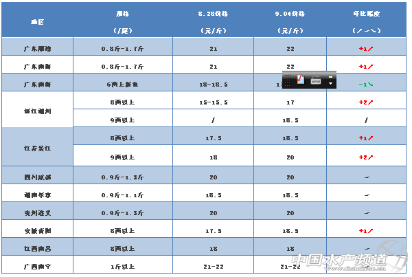 中國水產頻道獨家報道, 1、廣東地區加州鱸老魚進入最后清塘階段,8兩以上老魚統貨今天塘頭價上漲了1元/斤,達到22元/斤,以目前舊魚的價格流通商收魚反而虧本,F在上市的新魚還是魚頭集中在1.0-1.1斤,6兩以上統貨價17元/斤,魚頭在1.3斤以上的,6兩以上統貨價17.5元/斤,比上周下跌了1元/斤。 2、江蘇吳江地區老鱸價格又漲了,9兩以上價格達到20元/斤了,8兩以上價格18.5元/斤。因為魚頭在1.5斤以上的庫存越來越少了,魚頭在1.2斤左右的居多,要過10多天這些魚才能長到1.5斤以上,所以這10多天的大魚頭貨源還是比較緊缺,部分供應商跑到浙江湖洲等地開魚去了。 3、其他地區地老魚存塘量不多,新魚未達到上市的規格,本周大部分地區價格與上周持平,只是浙江湖洲價格受江蘇吳江價格影響上漲了1-2元/斤。