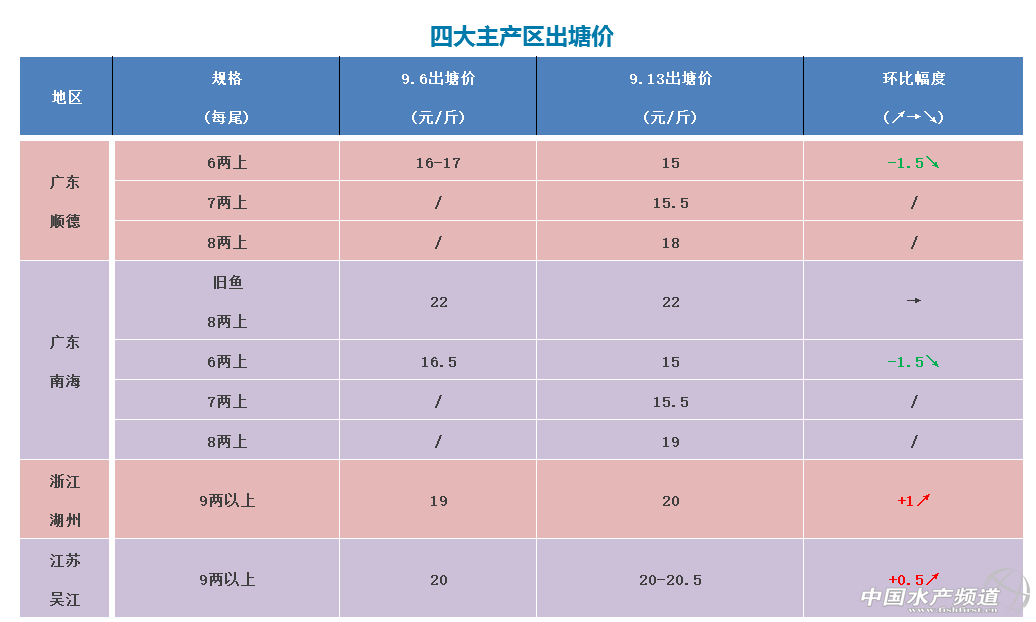 | 中國水產(chǎn)頻道獨家報道, 文/圖 杰大飼料 水產(chǎn)前沿實習(xí)編輯李靜 聯(lián)合發(fā)布 進入九月中旬,廣東地區(qū)加州鱸新魚大量上市,價格明顯下滑。因近來加州鱸新魚跌幅明顯,很多養(yǎng)殖戶著急出魚。考慮到有可能持續(xù)下跌,大部分養(yǎng)殖戶選擇出6兩上規(guī)格,希望能趕個好價錢;一小部分養(yǎng)殖戶選擇出8兩上規(guī)格,提高產(chǎn)量和利潤。也有一小部分養(yǎng)殖戶因這段時間廣東地區(qū)高溫天氣持續(xù),選擇月底出魚。高溫天氣遇到大雨,容易引起翻塘,養(yǎng)殖戶需要注意改底調(diào)水,合理使用增氧機。 四大主產(chǎn)區(qū)行情分析 廣東順德:今天新魚6兩上報價15元/斤,7兩上今天報價15.5元/斤,新魚8兩上18元/斤,但要求有一定規(guī)格的魚頭,1.4斤魚頭左右。 廣東南海:今天舊魚8兩上報價22元/斤,基本已經(jīng)清完。本地新魚上市數(shù)量增多,今天6兩上報價15元/斤,7兩上報價15.5元/斤,8兩上報價19元/斤。 浙江湖州:9兩以上規(guī)格報價是20元/斤。湖州存塘量非常少,基本上沒有什么人出魚。 江蘇吳江:9兩上的報價是20-20.5元/斤。目前吳江的舊魚存塘量不斷減少,隨著吳江地區(qū)存塘量減少,還有北方市場偏愛大規(guī)格的鱸魚,所以最近吳江標魚的價格還應(yīng)該會有所上漲。根據(jù)一些流通商反應(yīng),吳江地區(qū)新口魚估計在9月底有少量可以上市。 四川:報價8兩上19.5元/斤,本周需求量和出魚量都明顯減少。9月11日下跌1元/斤,目前舊魚存塘量較少,新魚大都未到上市規(guī)格,預(yù)計國慶前后會有新魚出。 湖北武漢:還沒有新魚上市,預(yù)計月底才有魚達到上市規(guī)格。 廣西南寧:一斤以上價格20.5元/斤,對比上周有所下降。目前由于氣溫降低,出魚損耗減少,養(yǎng)殖戶出魚熱情明顯上升,預(yù)計接下來價格或持穩(wěn)一段時間。 安徽青陽:8兩以上19元/斤,相比上周上漲0.5元/斤,夠規(guī)格的魚所剩無幾,剩下的月底也會清完。目前新魚普遍4兩左右,基本都是明年才賣。 日常管理小貼示 到了養(yǎng)殖中后期,魚塘的代謝廢物不斷積累,氨氮、亞硝酸鹽也積累到了頂點。有經(jīng)驗的養(yǎng)殖戶會在高溫季節(jié)來臨前,水質(zhì)各項指標還未超標時就開始注重水質(zhì)調(diào)控。“冰凍三尺非一日之寒”,正因為代謝廢物是不斷積累的,所以水質(zhì)調(diào)控也是一個循序漸進的過程,不可操之過急。很多人見到短期內(nèi)無效果便堅持不下去,自然也管理不好水質(zhì)。 |