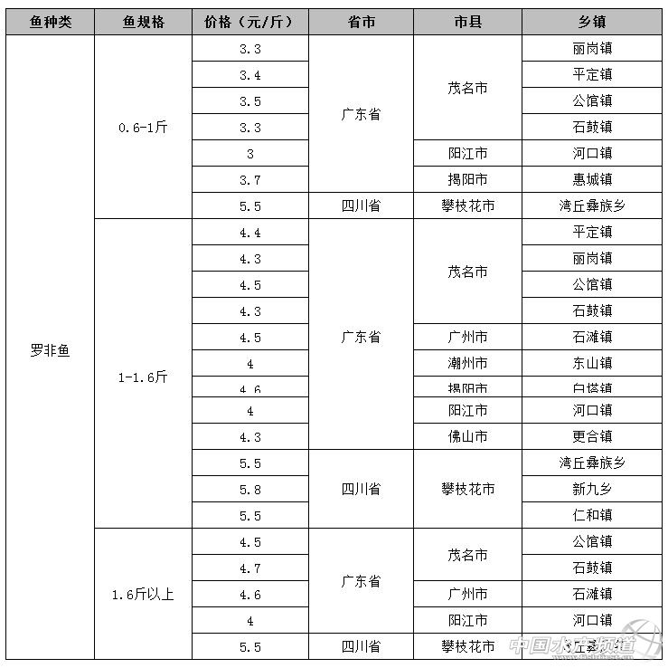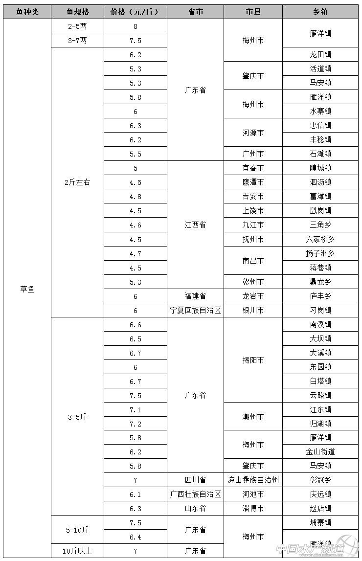 中國水產頻道報道, 通心粉社區為您整理播報本周全國主產區魚價行情匯總,包括草魚、鯉魚、羅非魚、斑點叉尾鮰、鰱魚(白鰱)、鳙魚(花鰱)、鳊魚的出塘價。 因魚價時有波動,本報價僅供廣大養殖戶參考,具體魚價請以當地為準。 【草魚】 【鯉魚】 【羅非魚】 【斑點叉尾鮰】 【鰱魚(白鰱)】 【鳙魚(花鰱)】 【鳊魚】 |