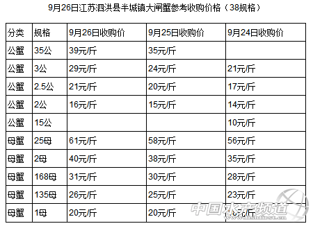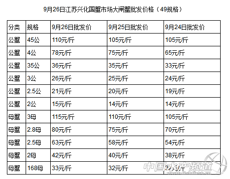 9月26日安徽宣城水陽地區大閘蟹收購價格(49規格)