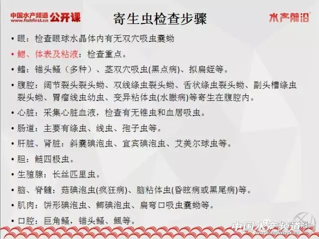 中國水產頻道獨家報道, 本文摘自中國水產頻道第38期公開課,由福建海大技術服務部工程師羅后兵老師主講的《水產養殖寄生蟲的防治訣竅》,主要從5個方面進行講述:①寄生蟲的危害②寄生蟲的種類③寄生蟲的判斷④寄生蟲在日常管理中的措施⑤寄生蟲的治療訣竅。 文/中國水產頻道 周雙艷整理 1、病害產生的原因 水產養殖會遇到各種各樣的病害,病害的產生不是某一個因素造成,而是由環境、體質和病原三者共同起作用的結果。 從這個病害圖譜可以發現,水產動物一旦產生了病害,就需要對環境、體質、病原進行分析。環境包括水質、水色、底質、水溫、光照等; 體質包括餌料、苗種、日常管理等; 病原包括細菌、真菌、病毒和寄生蟲。 病害三要素(環境、體質、病原)包含的內容非常多,今天跟大家講的主要是病原里面的寄生蟲。 在病害的診斷中,水產動物發病時,首先要檢查有沒有寄生蟲;治療用藥時,原則上從寄生蟲開始。 2、寄生蟲的種類 水產寄生蟲主要分為3大類: 第一類:原生動物類(也叫做原蟲類) 常見種類:鞭毛蟲、變形蟲、孢子蟲和纖毛蟲; 主要特征:基本屬于單細胞動物,比較低等。除了小瓜蟲個頭比較大以外,其它的蟲基本比較小。在100倍顯微鏡下才能看清楚它的形狀。 第二類:蠕蟲類 常見種類:單殖吸蟲、復殖吸蟲、絳蟲、線蟲、棘頭蟲、魚蛭等; 主要特征:一般個頭比較大,在40倍顯微鏡下看得非常清楚,甚至有些種類如寄生在腸道的絳蟲和線蟲類肉眼都清晰可見。 第三類:寄生蟲甲殼動物類 常見種類:中華鳋、苗頭鳋、鲺、魚虱和魚怪等; 主要特征:個體比較大,很多品種肉眼可以看得到。 3、寄生蟲的危害 水產動物一旦得了寄生蟲,首先會引起不攝食、生長發育緩慢、抵抗力下降,嚴重者甚至死亡,具體危害主要表現在5個方面: 、贆C械性的刺激和損傷:主要表現在兩方面:一是寄生蟲本身對魚蝦的傷害;二是寄生蟲會造成魚蝦因為癢痛而去刮擦,造成表皮出現大面積傷口并發炎(更常見)。 ②奪取營養:寄生蟲會奪取水產動物的營養,使得水產動物體質下降,身體消瘦。 、蹓浩群妥枞后w內有大量寄生蟲寄生時,對魚蝦組織造成壓迫,引起組織萎縮、壞死、甚至死亡,以肝臟、腎臟等內臟器官為常見。 、芏舅刈饔茫杭纳x在魚蝦體內會產生代謝產物,并將代謝產物排在宿主體內,有些寄生蟲可能會分泌特殊的有毒物質,這些代謝物或有毒物質作用于魚蝦可能會引起中毒現象。 、萜渌膊〉拿浇椋何逞旱募纳x往往是另外一些病原體入侵的媒介。即一旦產生了寄生蟲,真菌、細菌、病毒等其它的病原體就有機會入侵魚體。 4、寄生蟲的判斷 首先通過肉眼或者日常管理進行預判,預判有以下5點可以作為參考: 、偻蝗怀霈F吃料量下降或者長時間投餌率不足; 、谠陴B殖過程中發現有水產動物損耗死亡,且損耗的水產動物身體消瘦,表皮有刮擦的傷口; 、墼谘蔡恋倪^程中發現有水產動物靠邊或者浮在水面,得寄生蟲的一個典型特征是打轉,打轉是區別于缺氧和中毒不一樣的特征; 、馨l現體表和鰓部的粘液突然間明顯增多,或有像泥巴一樣的臟東西,偶爾還能發現鰓絲有受傷破損; ⑤有些寄生蟲有特定的特征,比如小瓜蟲寄生時水產動物身上就會長白點,孢子蟲寄生時水產動物的鰓部或者體表會長白色的孢囊。 確診:寄生蟲病不管怎么觀察預判,最終確診還是要靠顯微鏡。 5、檢查步驟 用顯微鏡檢查魚體寄生蟲主要重點在于鰓、體表和粘液。 注意事項:除了鰓、體表和粘液以外,魚的很多部位(比如眼睛、腹腔、腸道、肝、膽)都會得寄生蟲,所以在用剪刀解剖魚體的時候,要仔細觀察魚體內的各個部位,例如:如果發現魚的眼睛有突出或者發白的現象時,應該看看眼睛里面有沒有雙穴吸蟲類的寄生蟲。 不管怎么檢查,顯微鏡下檢測寄生蟲鰓部、體表和粘液必不可少。 6、寄生蟲繁殖條件 在水產養殖中,寄生蟲完全有辦法預防,可以做得到少得或者不得寄生蟲。要預防和不得寄生蟲,首先要知道寄生蟲的繁殖條件,也就是寄生蟲在什么環境下長得最多: 、俅笞匀坏慕雍1旧砭陀屑纳x存在,它是天然的; ②寄生蟲喜歡含有機物多和底部很骯臟的水體; ③養殖密度越高,寄生蟲傳染速度越快; 、芰魉桓纳x喜歡死水,在養殖環境下水不流動,有可能是因為增氧機開不夠或者溶解氧不夠; 、菁纳x首先感染的是體質差的動物,如果魚的體質很好,寄生蟲就繁殖不起來; 、逌囟取Ⅺ}度等各個條件適宜寄生蟲的繁殖,淡水有淡水的寄生蟲,海水有海水的寄生蟲; 、呒纳x有特定的感染群體和感染時間。例如,金鯧魚主要是小瓜蟲,小瓜蟲正常高發的季節,在每年的5-7月或者10-11月。 寄生蟲的繁殖條件對指導生產有很重大的意義,防治的訣竅都是基于這幾個因素,進行分析和針對性的處理。 7、預防措施 預防措施1:合理的養殖密度。密度越高,寄生蟲傳播的速度越快。 預防措施2:選用多品種混養的養殖模式。寄生蟲也有天敵,利用自然規律,保持池塘里面生物的多樣性,就可以預防各類病害的發生。如魚蝦混養模式,在混養模式下,魚類的大部分寄生蟲病很少甚至沒有出現。 預防措施3:日常管理:核心是減少水體的有機物,控制底質骯臟的程度(這里面有很多的文章可以做)。 這里跟大家分享幾個訣竅: ①每造結束以后要清淤、曬塘,每造開始前要徹底清塘:大多數寄生蟲能以包囊的形式保留在
