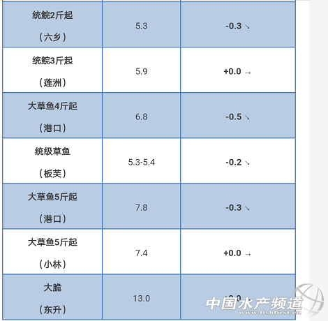 文/圖 珠海海龍、水產(chǎn)前沿 吳佳輝 草魚(yú):脆肉鯇流通順暢,行情向好 中國(guó)水產(chǎn)頻道原創(chuàng)報(bào)道,目前草魚(yú)種板塊的市場(chǎng)存塘壓力大,流通緩慢,導(dǎo)致價(jià)格快速下跌,后期價(jià)格估計(jì)還會(huì)小幅度下跌;統(tǒng)鯇和大草魚(yú)的價(jià)格有了小幅度的下滑,市場(chǎng)存塘不多,流通量一般,市場(chǎng)需求不明顯;脆肉鯇的流通比較順暢,新脆未上市,行情持續(xù)走好。 草魚(yú) ※上述報(bào)價(jià)可能會(huì)因區(qū)域、規(guī)格、品質(zhì)和時(shí)間等因素的不同而會(huì)產(chǎn)生差異,在此僅供參考。 【關(guān)鍵字】:草魚(yú) 草魚(yú)價(jià)格 水產(chǎn)養(yǎng)殖 |