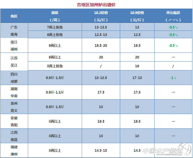 中國水產(chǎn)頻道獨家報道, 加州鱸 1、廣東地區(qū)新鱸因節(jié)后銷量下滑,價格暫時穩(wěn)定,主要還是看魚頭定價,7兩以上塘頭價還是13元/斤,魚頭偏小會便宜0.5元/斤,魚頭偏大則會高0.5元斤,8兩以上塘頭價在16元/斤左右。市場依然緊張的是1斤以上的大鱸,這個規(guī)格的鱸魚價格還是比較堅挺,廣東價格下滑,吳江碼頭的停工,鄭州等市場回到廣東,廣東9兩以上的鱸魚價格還會有上漲的空間。 2、江蘇吳江老魚不多,9兩以上價格還是在20元/斤左右,現(xiàn)在主要裝新魚為主,8兩以上1.2斤魚頭,塘頭價16元/斤。浙江湖州大魚頭老魚基本沒有了,9兩以上的魚還是19.5元/斤,當(dāng)?shù)匦卖~不大,要到10月底才能出8兩以上規(guī)格的魚。 3、本周四川成都價格下滑了0.5-1元/斤,其他地方價格與上周持平。 |