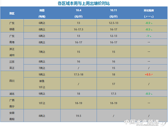 中國水產頻道報道, 文/ 杰大飼料、水產前沿 李靜 聯合發布 行情分析 廣東順德:因目前6兩上規格價格偏低,所以很多養殖者選擇出7兩上規格,實際上車規格在7.5兩以上,價格14-14.5元/斤,比上周漲了0.5-1元/斤。雖然中秋國慶節日已過,加州鱸市場需求依然比較大,特別是大規格魚市場依然比較緊張,需求量很大,所以價格依然堅挺,甚至略有升高。 廣東南海:看魚頭規格和平均上車大小定價。8兩上規格價格較好,故養殖者以出7兩上和8兩上為主。另外沙頭地區加州鱸爛身、出血等病害較為嚴重,針對發病的加州鱸部分養殖者謹慎起見選擇推遲出魚。 浙江湖州:湖州新口7兩抓起,報價15元/斤,目前湖州地區每天都有少量新口魚上市,特別是國慶節以后,全程投喂飼料的新口鱸魚也可以上市,目前價格相對平穩。 江蘇吳江:吳江新口鱸魚,今天7兩上規格報價15元/斤,8兩報價為16元/斤。從9月25號剛開始,吳江地區陸續有新口鱸魚上市,但是數量不多,故目前新口鱸魚價格比較穩定。 湖北清江:9兩上規格17.5元/斤,受廣東新魚影響價格略降。本地加州鱸基本已出完,新魚才三兩左右,要明年6月份才能上市。 廣西南寧:1斤以上規格報價18-19元/斤,與上周持平。中秋國慶節后消費量持續上升,市場需求仍然比較大,預計后市或穩中有升。 四川:雙節期間9兩上舊魚先從18元/斤跌至17.5元/斤,后因市場大規格魚需求強勁,節后又回升至18元/斤。目前已有新魚陸續上市,1斤規格起抓17元/斤。 安徽青陽:舊魚全部出完,本周沒有報價。新魚剛完成分塘,平均5-6兩,為避開主產區魚集中上市的沖擊,養殖戶會選擇明年才賣魚。 |
