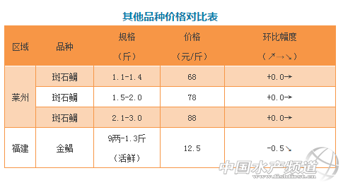 對比8月17日的報價,可以發現,海南1.0-1.5斤規格的珍珠龍膽價格上漲了6元/斤,1.5-2.0斤規格的上漲了4元/斤;山東萊州2斤一下的上漲了3元/斤,5.0-6.0斤規格的上漲了8元/斤,這或許可以歸功于暑假以及國慶節這種假日效應。從本周的情況來看,小規格的珍珠龍膽價格上漲1元/斤,而3斤以上的珍珠龍膽則下降或者持穩。本周來看,石斑魚的價格相對比較穩定。