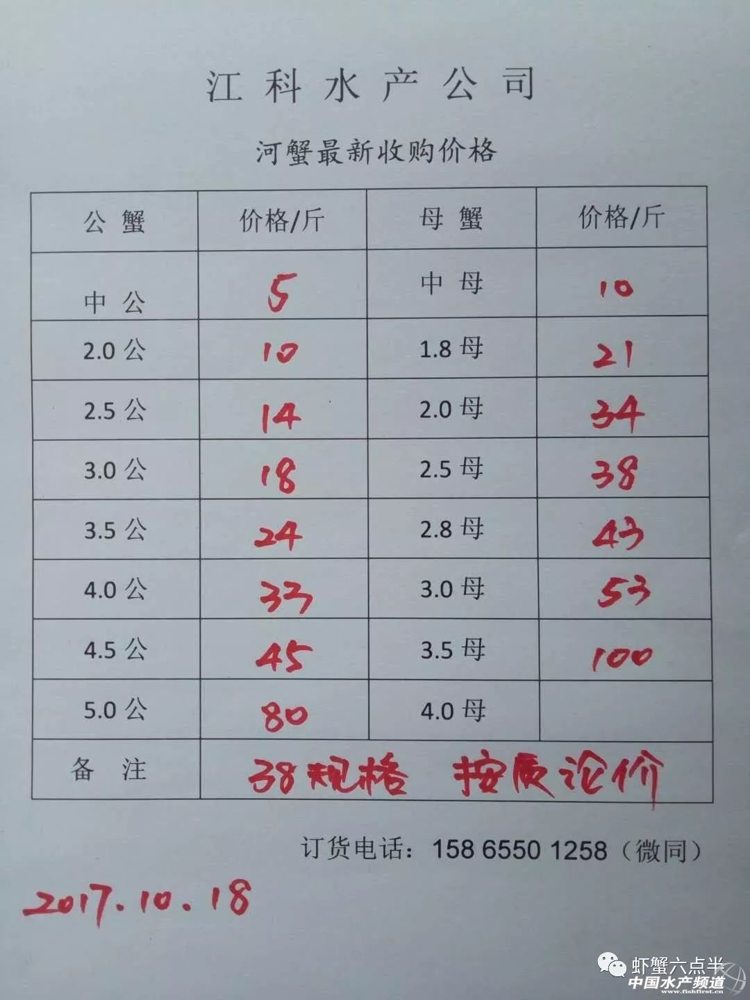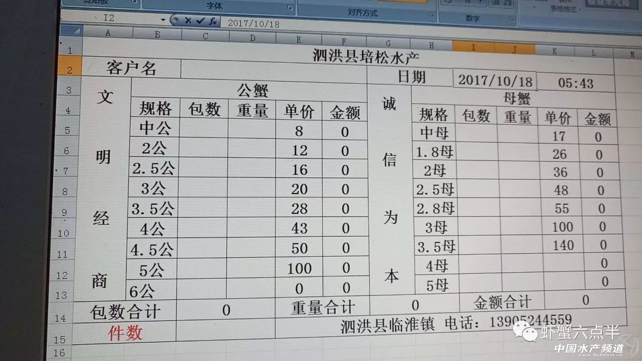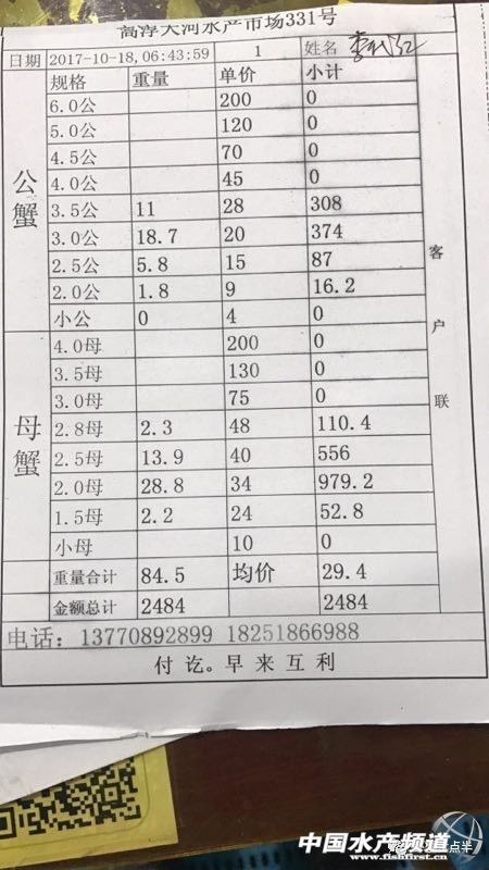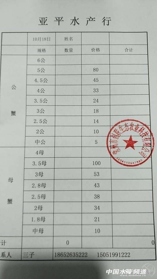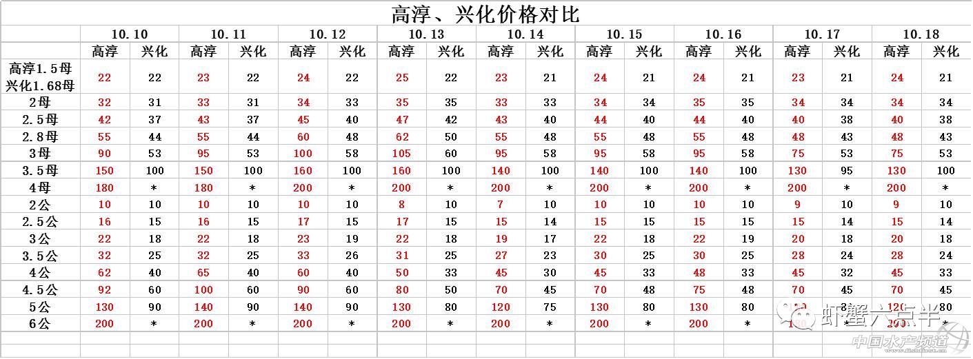 中國水產頻道報道, 大閘蟹 興化和高淳價格差異較大,同規格幾乎相差一倍的價。質量好,規格還可以的養殖戶可以考慮到上海、無錫等地賣螃蟹。 高淳 湖北 興化 宜興 泗洪 山東東營 龍蝦價格 (報價是為了讓養殖戶能早點了解價格信息,根據行情賣螃蟹,盡量賣個好價錢。希望養殖戶朋友也能參與報價,能更快更早的了解當天行情。) |