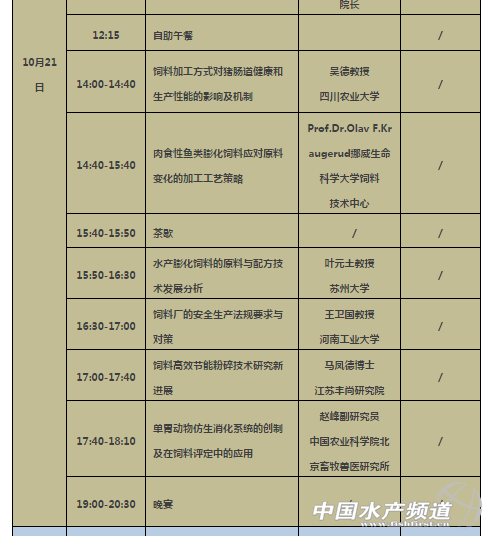 中國水產頻道報道, 第二屆國際飼料加工技術研討會 (第三輪通知) 2017年10月20-22日,江蘇·揚州會議中心 主辦: 中國農業科學院飼料研究所 承辦: 中國農業科學院飼料研究所飼料加工創新團隊 協辦: 江蘇豐尚智能科技有限公司 北京英惠爾生物技術有限公司 江蘇省飼料工業協會 中國水產頻道 《水產前沿》雜志 支持單位: 廣東恒興飼料實業股份有限公司 四川新鑫元農牧機械有限公司 山東龍昌動物保健品有限公司 四川藍雨禾環保科技有限公司 艾卡(廣州)儀器設備有限公司 安捷倫科技(中國)有限公司 項目支持: 農業部公益性(農業)行業專項(201203015) 現代農業產業技術體系北京市鱘魚、鮭鱒魚創新團隊 現代農業產業技術體系北京市家禽創新團隊 各位學術界及企業界同仁: 為了提高我國飼料加工工藝技術水平,提供一個與國際同行交流的平臺,促進我國飼料加工技術不斷發展創新,定于2017年10月在江蘇揚州召開第二屆國際飼料加工技術研討會,本次會議主題為“工藝技術提升飼料品質和效率”,大會組委會熱忱歡迎您的參加,熱烈歡迎企事業單位提供贊助。現將有關事項通知如下: 一、時間 2017年10月21日至22日,20日報到。 二、地點 揚州會議中心,江蘇省揚州市邗江區七里甸路1號。電話:0514-87802588 三、會議議程 統一由大巴車送回揚州會議中心或乘車地點 揚州會議中心交通路線 1.從上海方向開車:從揚州西出口下高速沿文昌西路向前至揚州國展中心左轉彎到揚州會議中心(市委黨校); 2.從南京方向開車:從揚州西出口下高速沿文昌西路向前至揚州國展中心左轉彎到揚州會議中心(市委黨校); 3.從天長方向開車:從揚州北出口下高速沿揚子江北路至文昌西路右轉揚州農業銀行、揚州工商銀行十字路口紅綠燈)直走至揚州國展中心紅綠燈右轉揚州會議中心(市委黨校); 4.南京機場:乘坐機場大巴至揚州市區(1小時一班),再乘出租車,約5.6公里,13元左右; 5.鎮江站/鎮江南站:乘大巴車至揚州西部客運樞紐(20分鐘一班),再乘坐出租車10元左右; 6.揚州泰州機場乘坐機場大巴到達市區(12:30之前1小時一班,12:30之后13:30、17:15、19:30、20:30各一班),再乘坐出租車到揚州會議中心,20元左右; 7.從西部客運樞紐(火車站、汽車站)打的到揚州會議中心(市委黨校),10元左右; 8.從汽車東站乘19路車至育才小學或(蘇北醫院)站臺下轉乘1路車至揚州市委黨校站下(揚州會議中心),出租車約40元; 9.公交1路車停靠站臺:揚州會議中心(市委黨校)-來鶴臺廣場(富春酒樓)——揚大師院(瘦西湖南門)——石塔寺(市中心)——蘇北醫院,時間:6:18——22:02。 10.公交101路車停靠站臺:揚州職大(國展中心,向北400米到達會議中心)——汽車西站——揚州商城——曲江商品城——汽車東站,時間:6:20——18:30。 地 址:揚州市邗江區七里甸路1號 郵 編:225126 電 話:0514-87802588 傳 真:0514-87888167 聯系人:徐飛15052565420 會前花絮精彩分享—— |