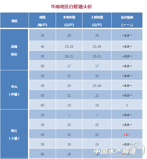 中國水產頻道獨家報道, 文/水產前沿 彭曉君 + 南方白對蝦:高位池紅體病爆發 華南地區白蝦塘頭價分析 珠海、新會:羅蝦逐漸清塘,準備進入冬棚模式,價格上漲阻力較大,目前珠三角白對蝦價格沒有什么變化。 廣西、湛江:近期蝦塘發病增多,湛江地區紅體病爆發,病蝦上市沖擊了蝦價,價格有所下滑。 福建:當地大部分開始準備冬棚養殖,清塘出蝦量增加,蝦價繼上周回落后本周維持穩定。 華東地區白蝦塘頭價分析 江蘇如東:目前小棚蝦開始出售,主要規格在60-100頭,價格較外塘低1-2元。外塘蝦已經接近尾聲,目前價格相對穩定。 浙江:由于外塘蝦養殖接近尾聲,活水蝦價格較好。加上晚造大棚開始較晚,加上目前的大棚效果一般,所以大棚出蝦不多,外塘活水蝦價格繼續看好。 北方白對蝦:存塘大蝦少,蝦價略有上升 河北唐山:本周活蝦價格上漲2元,冰鮮蝦維持原價但是受活水蝦漲價影響幾乎沒有養殖戶賣冰鮮蝦!據了解,目前北方的工廠化蝦很少,目前投苗的也有很多排糖,預春節前才會上市。 天津寶坻:預計報完這次價格,下周基本就沒有外塘蝦了,一些大棚已經開始準備投苗。據天津海大陳梁斌介紹,目前河北地區“外塘結束,大蝦稀缺,蝦價低迷”,剩下的蝦摟底拋售,有錢就賣。目前70頭的10元/斤,60頭的11元/斤。 山東:本周東營、濰坊、濱州的土塘已經接近尾聲,預計月底即將結束。由于目前出售的多是狀態不好的蝦,所以價格只是小幅上漲。如東地區的下需要等半個月后才陸續上市,預計價格大幅拉升還需要一段時間。 東北、西北地區白蝦塘頭價分析 遼寧營口:營口外塘蝦也已經基本結束,由于環保限制,工廠化市場會嚴重缺蝦,預計今年蝦價會遠遠高于往年同期。 東北、西北地區白蝦塘頭價 斑節對蝦 斑節對蝦塘頭價分析 陽江:本周斑節對蝦價格沒有什么變化,目前存塘不多,大部分養殖戶準備搭冬棚養殖南美白。 斑節對蝦塘頭價 東南亞對蝦:蝦價穩定或上漲,波動不大 蝦價分析 本周(10月11日-10月16日),越南白蝦和馬來西亞白蝦在本周價格保持穩定,印度地區白蝦價格有小幅上漲。其中60尾/公斤的草蝦價格同比上漲0.8元/斤,目前的價格為17.1元/斤。40尾/公斤的價格為22.4元,比之前的價格上漲了1.5元/斤。 根據越南媒體報道,今年前8個月越南出口美國白對蝦市場份額為41.6億美元,比去年下降4.4%,但是對中國、日本、巴西和東盟的貿易額有明顯增加。目前美國在越南白對蝦出口額已經從2006年的第一降到第四。 印度白蝦出口數據相對好看很多,根據印度海洋產品出口發展局(MPEDA)的數據,截止今年6月份,印度白蝦出口量增加25%,出口產值增長16%,其中凍蝦貢獻做大。 對蝦塘頭價 注:以上產品為當地蝦類的塘頭收購價,匯率按2017年10月17日計算,1越南盾兌換0.0003人民幣 溫馨提示:東南亞國家對蝦塘頭價格行情由“海鮮指南”統計整理發布,僅供參考。市場有風險,交易需謹慎 |