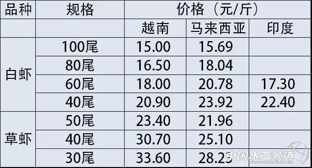 摘要: 本周(10月18日-10月24日),越南白蝦和馬來西亞白蝦在本周價格保持穩健的上漲,平均每公斤上漲幅度達到0.2元。100尾/公斤規格的價格目前在15元/斤左右,80尾/公斤的價格在16.5元/斤,40尾/公斤的價格在20.9元/斤。印 ...