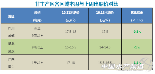 中國水產頻道獨家報道, 文/ 杰大飼料、水產前沿 李靜 聯合發布 近來天氣變化大,晝夜溫差比較大,適合寄生蟲繁殖,特別是錨頭鳋(俗稱丁蟲)寄生后容易引起花身、爛身等現象,影響賣相,建議做好預防并在出魚前打樣檢查。在魚塘進水后特別注意做好殺蟲消毒工作,養殖中后期投喂量大,水溫低有機質分解速度慢,水質容易惡化,要定期做好改底調水工作,防患于未然。 四大主產區行情分析 廣東順德:今天報價6兩上10元/斤,7兩上10.5元/斤,8兩上11.5元/斤,本周價格跌幅很大,基本上每天都不同價錢,因為6兩上價錢太低,大多數養殖戶都出7兩上規格,目前出魚高峰期,價錢也變動比較大。 廣東南海:今天6兩上報價10元/斤,7兩上報價10.5元/斤,8兩上報價11.5元/斤,8兩上價錢比昨天跌了近1.5元/斤,所以近來跌幅很明顯,因為跌幅太大,6兩上規格很多人不愿意出,因為報價過低,目前大多數養殖戶都選擇出魚7兩或8兩上。 浙江湖州:新口7兩抓起,報價14元/斤,8兩抓起15-15.5元/斤,具體看炮頭大小,統貨報價13元/斤。 江蘇吳江:新口7兩抓起,報價14-14.5元/斤,8兩抓起15-15.5元/斤。10月底吳江新口魚上市增多。 主產區各區域本周與上周出塘價對比 非主產區行情分析 四川成都:本周價格17.5元,同上周基本持平,現在開始市場上有少量新魚上市。目前市場供需趨于平衡,另因氣溫下降,本地市場開始有廣東加州鱸進入,到時可能對價格有一定沖擊。 湖北武漢:9兩上報價14-14.5元/斤,實際9兩上規格抓魚抓到接近1斤規格。 廣西南寧:1斤以上價格15.5-16.5元/斤,對比上周下降1.5元/斤,新魚上市量比較平穩,現在氣溫也比較適合生長,預計后市會保持一定的穩定。 |