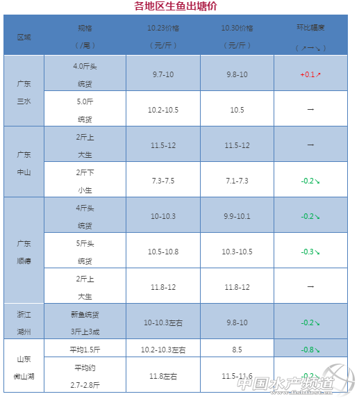 現在華東地區因為氣溫下降,養戶出魚較多,但因當地魚不耐存,銷量較少,目前這個季節市場喜歡廣東魚多一點,價格比上周下滑了0.2-0.8元/斤左右。