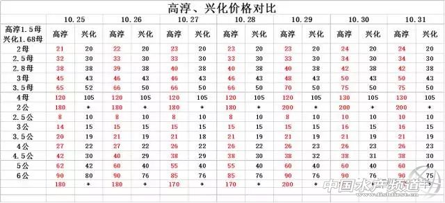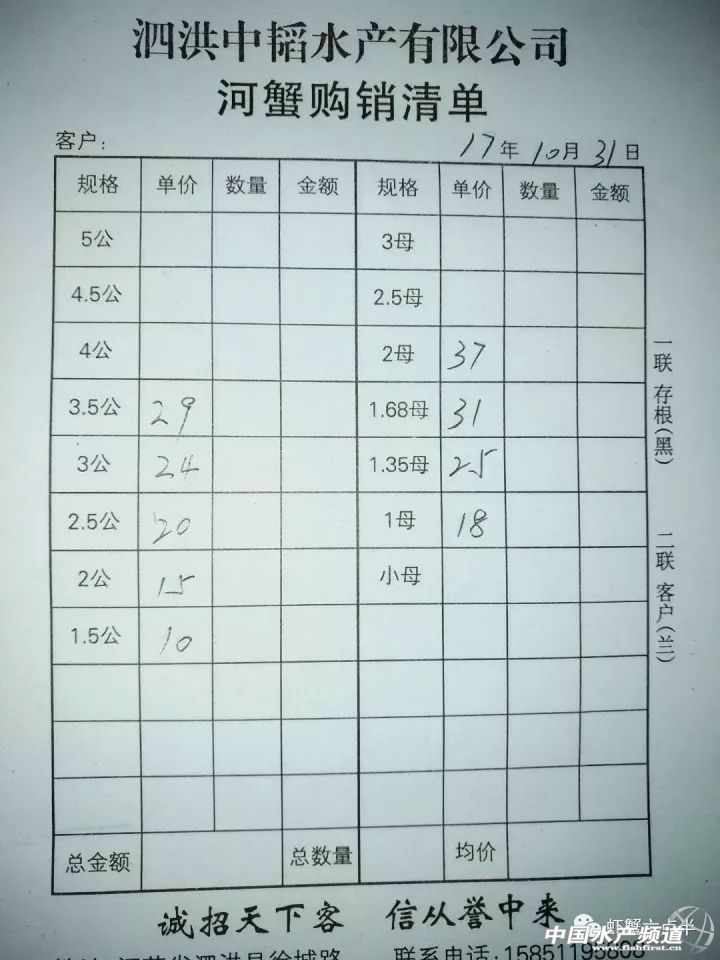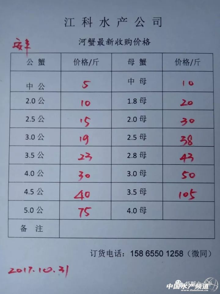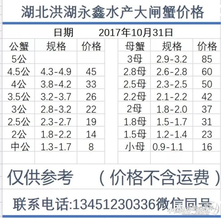 中國水產頻道報道, 2017.10.31 大閘蟹 一般門市都會加價收購,質量好加價更高。 興化和高淳價格差異較大,同規格幾乎相差一倍的價。質量好,規格還可以的養殖戶可以考慮到上海、無錫等地賣螃蟹。 高淳 湖北 興化 宜興 泗洪 揚州 龍蝦價格 (報價是為了讓養殖戶能早點了解價格信息,根據行情賣螃蟹,盡量賣個好價錢。希望養殖戶朋友也能參與報價,能更快更早的了解當天行情。) |