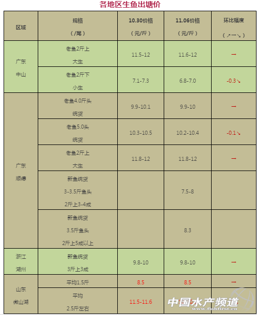中國水產頻道獨家報道, 文/圖 何氏水產、水產前沿 李靜 生魚 縱觀上周廣東生魚價格比較平穩,只進老魚2斤以下的價格下跌了0.3元/斤,現在廣東老魚所剩無幾,特別是魚頭偏大的存塘量更少,出一塘少一塘。因為老魚與新魚相比,口感好、刺少,出肉率高等優點,深受終端市場歡迎,導致老魚價格堅挺。因為最近廣東新魚也開始大量上市,價格也創歷史新高,3.5斤頭,2斤以上占5成以上,最高價格訂到8.3元/斤,廣東新魚早批魚不多,夠大的新魚也是見一塘捉一塘,推高了魚價,新魚的上市,也會對2斤以下魚的價格有些沖擊,導致中小生價格下滑了0.3元/斤。 浙江湖州的新魚統貨價格與上周持平,塘頭也是根據魚頭的大小還有3斤以上的比例來定價。山東微山湖那邊新魚也在大量上市,由于當地市場行情一般,魚頭也不大,部分供應商喜歡跑到廣東來拉魚頭大的魚回當地賣,導致當地平均2.5斤左右的魚價格下滑了1元/斤。 |