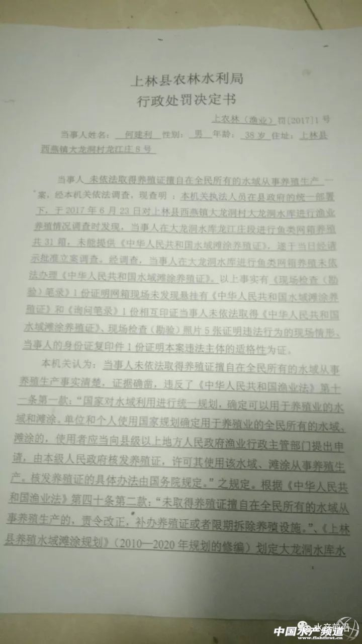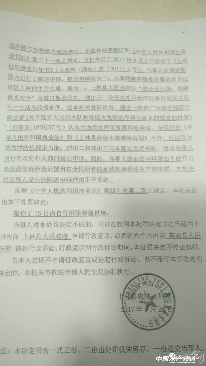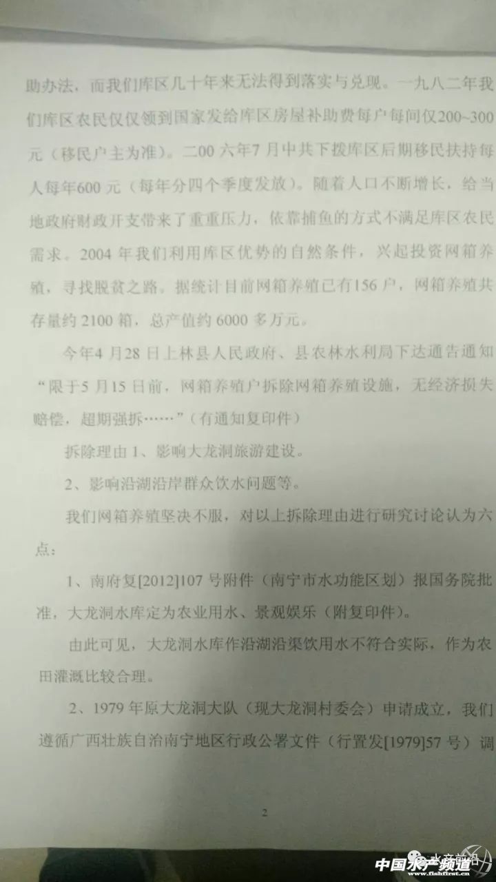 中國水產頻道獨家報道, 文/水產前沿 綜合報道 昨夜,廣西南寧市上林縣農商會會長潘健章(以下簡稱“潘會長”)致電筆者尋求協助,表示上林縣有八百多萬斤不同規格的網箱養殖淡水魚急需處理,原因是政府將于2017年11月8日起,預計一個月內將對該縣非法養魚網箱強制拆除。 據潘會長介紹,大龍湖屬于風景區,同時屬于飲用水源,屬政府規定的禁養區。近年來不斷有養戶在該區域進行非法養殖,對大龍湖風景區水質及飲用水源造成一定程度的污染。 潘會長還向筆者反映,關于網箱拆除的通告,上林縣人民政府等有關部門已向當地養殖戶發出過多次。2017年4月28日發布了《上林縣人民政府關于對大龍湖景區進行綜合整治的通告》,限各網箱養魚戶于2017年5月15日前自行處理養殖魚類并拆除養魚網箱;上林縣農林水利局2017年9月26日根據《中華人民共和國漁業法》第四十條第二款的規定,做出了“限期于15日內自行拆除養殖設施”的行政決定,并于2017年11月2日根據《中華人民共和國行政強制法》第三十五條的規定,向各網箱養魚戶發出強制拆除前催告書,限各網箱養魚戶三日內自覺履行上述行政決定;2017年11月7日,上林縣人民政府依據《中華人民共和國行政強制法》第四十四條的規定發布《上林縣人民政府關于強制拆除大龍湖景區養魚網箱的通告》,通告表示將于2017年11月8日起組織有關部門對非法養魚網箱執行強制拆除。 上林縣人民政府關于強制拆除大龍湖景區養魚網箱的通告 1979年,該水庫允許漁業生產的文件 2017年8月21日,該地區5名養戶自費去北京上訪的文件 2017年9月26日,上林縣農林水利局對該地某養殖戶做出的處罰決定文件 “今天是該地區網箱強制拆除的第一天,參與拆除的政府相關工作人員超過百人,并攜帶警犬、配有救護車等。”據上林縣某養殖戶反映,當初因修建水庫,自家的農田被淹,多年來只能靠漁業為生。如今網箱拆除,生計難以維持。他們在今年8月21日曾組團到北京上訪,卻被告知不能越級上訪,訴求被返回本地相關部門處理。 潘會長告訴筆者,政府近日要求上林縣商會積極提供渠道,協助養殖戶賣魚。養殖戶除了自己聯系魚中,也可以通過上林縣商會的渠道,盡量按照市場價格從優賣魚。 以下為上林縣急需清理的網箱養殖品種及數量清單,希望廣大有需要的朋友盡快聯系潘健明報價和收購,電話:13924846322 【關鍵字】:清拆 網箱 水產養殖 |