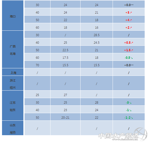 中國水產(chǎn)頻道獨家報道, 文/粵海飼料集團、中國水產(chǎn)頻道 彭曉君 各產(chǎn)區(qū)白對蝦一周價格分析 湛江、?冢罕局芪r價小幅上漲,打水車價格較高。目前抓冰蝦較少,冬蝦養(yǎng)殖開始,后市穩(wěn)中有漲。 珠海新會:本周暫停報價。存塘蝦很少,出蝦少,存蝦溫度低吃料和長速放慢,但病害不多。養(yǎng)殖冬棚蝦的普遍在整塘、蓋冬棚,很個別的開始放冬棚苗。 廣西北海:近期因為冷空氣影響,存塘規(guī)格蝦大幅度減少,大規(guī)格蝦量少價漲,中規(guī)格蝦價格持平或略有下跌。目前存塘的規(guī)格蝦大多是發(fā)過病留來繼續(xù)養(yǎng)的,加不上料,產(chǎn)量也比較低,有些近十畝的塘都抓不夠一活鮮車,在一定程度上也影響價格。整體成交量較低,價格波動震蕩較大。 中山:中山南朗45尾21元/斤,東升沙朗50尾18元/斤,中山南50尾19元/斤,港口40尾23元/斤,阜沙東鳳45尾23元/斤,魚窩頭40尾25元/斤,順德均安40尾26元/斤,60尾18元/斤;中山南受天氣影響,蝦吃料普遍較慢,病害較多,主要應激、紅須、紅尾等,養(yǎng)戶出蝦意愿較強,出蝦普遍在50-60尾/斤;東升沙朗處于冬棚搭建階段;南朗受水溫影響,對蝦吃料較慢,其他地區(qū)溫度低,吃料慢,長速相對較慢。 汕頭:土塘存塘蝦規(guī)格主要在30-70尾/斤左右,40尾以上大規(guī)格蝦少。土塘養(yǎng)殖情況不佳,近期氣溫下降,土塘抓蝦量增加。本周蝦價同比上周上漲2-3元/斤。 漳州:高位池蝦養(yǎng)殖80%放苗一個月左右,無大規(guī)格存塘蝦;土塘存塘蝦規(guī)格主要在30-60尾/斤左右,隨著溫度下降,出蝦量逐漸減少,本周蝦價有明顯上漲,同比上周上漲2-3元/斤。 江蘇如東:價格總體呈下調(diào)趨勢,比上周下調(diào)2-3元/斤,主要因為近期降溫,小棚蝦病害多發(fā),出蝦量增加,且北方遠距離運輸水車還沒到,導致價格下跌。 。ㄉ虾!⒄憬B興、山東濰坊地區(qū)白蝦基本養(yǎng)殖結(jié)束,暫停報價。) 【關鍵字】:對蝦 價格 水產(chǎn)養(yǎng)殖 |