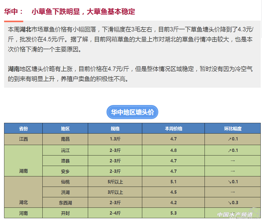 中國(guó)水產(chǎn)頻道獨(dú)家報(bào)道, 文/水產(chǎn)前沿 鄭鵬飛 隨著冬季的來臨,近期又會(huì)有一波冷空氣南下。目前東北地區(qū)中部和北部全天氣溫已經(jīng)降到了零度以下。按以往經(jīng)驗(yàn),冷空氣的來臨同時(shí)也意味著淡水魚消費(fèi)的升溫。目前江蘇、安徽、重慶等地的草魚價(jià)格有明顯上漲,湖北,福建等地價(jià)格有所下跌,廣西、珠三角、湖南等地草魚價(jià)格基本維持穩(wěn)定,部分地區(qū)有小幅波動(dòng)。 |