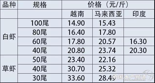 中國水產頻道獨家報道, 文/圖海鮮指南(seafood-guide)陳磊 注:以上產品為當地蝦類的塘頭收購價,匯率按2017年11月14日計算,1越南盾兌換0.0003人民幣 本周(11月8日-11月14日),越南白蝦的價格較為穩定,與上周相比基本沒有變化。100尾的目前的價格為14.90元/斤,80尾的價格為16.4元/斤。60尾每斤的價格為17.8元/斤。40尾的價格為20.8元/斤。印度地區的白蝦價格在本周卻降低的不少,60尾規格的價格目前為16.3元/斤,40尾的價格為20.3元/斤,均價降低了2元/斤。 相比之下,馬來西亞的白蝦和草蝦價格就更加的穩定,近一個月以來幾乎沒有波動。 印度白蝦被歐盟抽檢藥殘超標的事也還沒有過去,歐盟入境口岸將會采用更嚴格的措施對印度出口的白蝦進行檢驗。這一事態,也影響著印度白蝦未來的一大重要市場。 溫馨提示: 以上價格行情由“海鮮指南”統計整理發布,僅供參考。市場有風險,交易需謹慎。 【關鍵字】:蝦 塘頭價 水產養殖 |