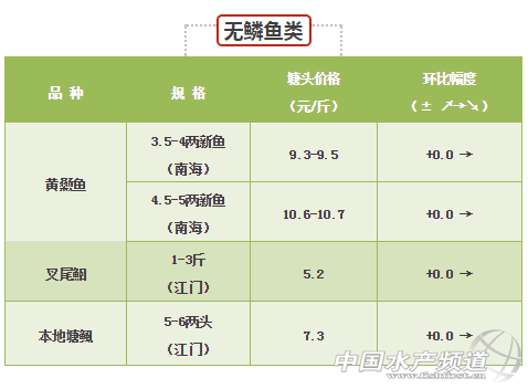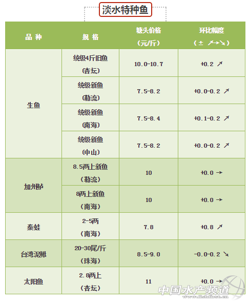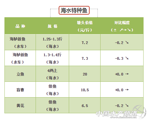 中國水產頻道獨家報道, 文/ 珠海海龍、水產前沿 吳佳輝 養好魚,更要賣好魚 珠三角地區最新魚價行情一手掌握 無鱗魚 黃顙魚流通量少,價格未有明顯上漲 黃顙魚市場出塘魚價因新魚基本還未達到上市規格,舊魚陸續在出,但因外省來廣抓魚的車還不多,因此整體魚價并未有明顯上漲,基本維持穩定。 ※上述報價可能會因區域、規格、品質和時間等因素的不同而會產生差異,在此僅供參考。 生魚舊魚量少,后市預期維持高位 生魚統級:10——10.7元,維持穩定。大規格生魚分級,4斤多頭,2斤上11.5-11.8元,2斤下7-7.3元。目前存塘舊魚不多。后市預期維持高位。新魚逐漸陸續上市,目前發價不穩定,看炮頭定價,7.5-8.5之間。 海鱸上市量大,爛市 由于市場符合規格的魚存塘較多,供大于求,鱸魚爛市,本周價格繼續下行,后市看跌。黃花魚價微跌、立魚價格穩定、盲曹價格穩定。 【關鍵字】: 無鱗魚 塘頭價 水產養殖 |