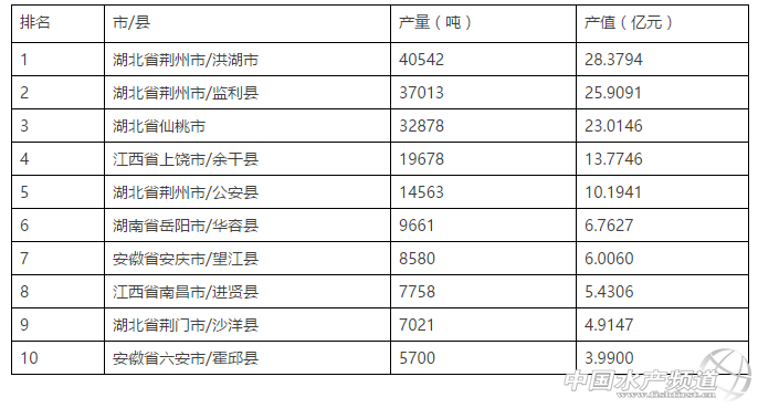 表3 2016年全國黃鱔養(yǎng)殖產(chǎn)量前10名的縣市名單