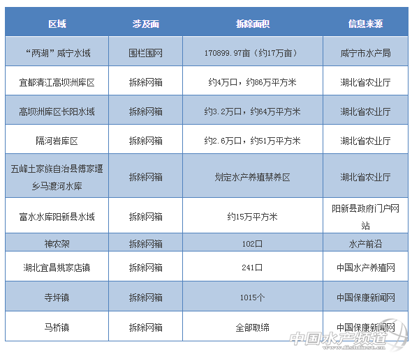 中國水產(chǎn)頻道獨(dú)家報(bào)道, 文/ 水產(chǎn)前沿 何鴻浩 網(wǎng)箱拆除只是一個(gè)縮影,這場環(huán)保運(yùn)動(dòng)勢(shì)必會(huì)影響到整個(gè)水產(chǎn)業(yè)的轉(zhuǎn)型走向以及速度 2017年是環(huán)保督查最嚴(yán)厲的一年,全國各地江河庫區(qū)網(wǎng)箱養(yǎng)魚遭到重創(chuàng),一批批網(wǎng)箱被快速拆除,燃煤鍋爐養(yǎng)殖被禁,溫室龜鱉被取締,以后養(yǎng)殖戶進(jìn)行養(yǎng)殖必須要8證齊全,缺一被罰。今年,種種爆炸性信息一波波沖擊,業(yè)界中嘩然一片,尤其是養(yǎng)殖戶迷惘于未來將何去何從? 其中,養(yǎng)殖網(wǎng)箱是近幾年重點(diǎn)關(guān)注對(duì)象,無證養(yǎng)殖網(wǎng)箱與違法新增網(wǎng)箱都被依法拆除。同時(shí),各省為保證水資源安全并治理水域環(huán)境問題,對(duì)不少區(qū)域進(jìn)行了重新規(guī)劃,部分網(wǎng)箱也因此被要求撤除。大勢(shì)所趨,網(wǎng)箱拆除只是一個(gè)縮影,這場環(huán)保運(yùn)動(dòng)勢(shì)必會(huì)影響到整個(gè)水產(chǎn)業(yè)的轉(zhuǎn)型走向以及速度,其影響將涉及飼料、種苗、流通等各個(gè)領(lǐng)域。筆者整理了近兩年部分關(guān)于圍欄、攔網(wǎng)、網(wǎng)箱拆除、大水面勸退的相關(guān)信息以及今年關(guān)于水污染防治規(guī)劃的相關(guān)條例以供讀者們參考,細(xì)看這些區(qū)域少了多少養(yǎng)殖面積?將來,產(chǎn)業(yè)又將如何發(fā)展? 全國多個(gè)省份拆除行動(dòng) 貴州省 貴州省在6個(gè)庫區(qū)10個(gè)縣(市、區(qū))均開展網(wǎng)箱養(yǎng)殖,涉及網(wǎng)箱養(yǎng)殖戶2742戶(珠江流域1914戶,清水江流域828戶),網(wǎng)箱養(yǎng)殖面積達(dá)17981.7畝(約1.8萬畝)。到2017年底,珠江、清水江各庫區(qū)網(wǎng)箱養(yǎng)殖面積減少至6361.9畝以內(nèi),其中不投餌生態(tài)網(wǎng)箱面積4996.6畝,投餌網(wǎng)箱養(yǎng)殖面積1365.3畝。同時(shí)在烏江干流庫區(qū),擬拆除446戶、72.3萬平方米的網(wǎng)箱,以保證庫區(qū)安全。(貴州省農(nóng)業(yè)委員會(huì)) 湖北省 湖北省全省122萬畝圍欄圍網(wǎng)網(wǎng)箱拆除工作已完成96.2%,27.45萬畝投肥(糞)養(yǎng)殖已全部取締;4.5萬畝珍珠養(yǎng)殖已全部取締。全省7個(gè)省級(jí)以上保護(hù)區(qū)對(duì)照問題清單積極推進(jìn)整改。目前,水生生物保護(hù)區(qū)禁捕工作已經(jīng)全面部署。(湖北省水產(chǎn)局) 湖南省 湖南省部署啟動(dòng)對(duì)全省涉及18個(gè)縣(市、區(qū))的10座大型水庫養(yǎng)殖污染的治理攻堅(jiān),治理重點(diǎn)為岸上畜禽規(guī)模養(yǎng)殖場(戶)退養(yǎng)和水庫人工投餌網(wǎng)箱、人工投餌圍欄退養(yǎng)。列入“退養(yǎng)”的大型水庫,包括3座飲用水源水庫,分別是水府廟、鐵山、官莊水庫;7座非飲用水源水庫,分別是柘溪、五強(qiáng)溪、皂市、蟒塘溪、托口、江埡、黃石水庫。飲用水源水庫禁止水產(chǎn)人工養(yǎng)殖,非飲用水源水庫科學(xué)規(guī)劃養(yǎng)殖。據(jù)測算,全省大型水庫需退養(yǎng)畜禽規(guī)模養(yǎng)殖面積53.2萬平方米、攔網(wǎng)86.9萬平方米、網(wǎng)箱98萬平方米。(中國環(huán)保信息網(wǎng)) 四川省 四川省人民政府辦公廳表示,到2020年,全省水產(chǎn)養(yǎng)殖區(qū)域布局更加優(yōu)化,養(yǎng)殖面積達(dá)到25萬公頃,稻漁綜合種養(yǎng)面積達(dá)到20萬公頃,水產(chǎn)品總產(chǎn)量達(dá)到180萬噸。全省漁業(yè)經(jīng)濟(jì)總產(chǎn)值達(dá)到560億元,產(chǎn)業(yè)結(jié)構(gòu)進(jìn)一步調(diào)整,涉漁一二三產(chǎn)業(yè)比例調(diào)整為6∶1∶3。全省農(nóng)民人均漁業(yè)收入達(dá)到840元以上;漁民人均純收入達(dá)到21550元,比2010年翻一番以上。省、市(州)、縣(市、區(qū))質(zhì)檢體系更加健全,水產(chǎn)品產(chǎn)地抽檢合格率穩(wěn)定在98%以上。建立2個(gè)省級(jí)水生生物自然保護(hù)區(qū);力爭創(chuàng)建7個(gè)國家級(jí)水產(chǎn)種質(zhì)資源保護(hù)區(qū),建立4個(gè)省級(jí)水產(chǎn)種質(zhì)資源保護(hù)區(qū)。建設(shè)增殖放流站和馴養(yǎng)救護(hù)中心10個(gè),年均增殖放流苗種1億尾以上。建設(shè)內(nèi)陸漁港5個(gè),捕撈漁船數(shù)控制在1.15萬艘以內(nèi),總功率不超過4.9萬千瓦。(四川省人民政府網(wǎng)站) 廣西壯族自治區(qū) 福建省 河南省 廣東省 東莞市海洋與漁業(yè)局表示,《東莞市東江流域供水通道敏感區(qū)域禁止養(yǎng)殖區(qū)和限制養(yǎng)殖區(qū)劃定方案》對(duì)東江流域劃定了水產(chǎn)養(yǎng)殖禁養(yǎng)區(qū)范圍和水產(chǎn)養(yǎng)殖限養(yǎng)區(qū)范圍。將東江流域飲用水源一級(jí)水源保護(hù)區(qū)范圍(包括水域和陸域)劃定為水產(chǎn)養(yǎng)殖禁養(yǎng)區(qū)范圍,將東江流域飲用水源二級(jí)水源保護(hù)區(qū)和準(zhǔn)保護(hù)區(qū)范圍(包括水域和陸域)劃定為水產(chǎn)養(yǎng)殖限養(yǎng)區(qū)范圍。水產(chǎn)養(yǎng)殖禁養(yǎng)區(qū)水域范圍內(nèi)的水產(chǎn)養(yǎng)殖活動(dòng),應(yīng)當(dāng)于2017年12月31日前停止養(yǎng)殖活動(dòng)或拆除設(shè)施。(廣東省農(nóng)業(yè)廳) 海南省 海南省?诮稙楸Wo(hù)水質(zhì)、落實(shí)海岸帶陸域水產(chǎn)養(yǎng)殖行業(yè)環(huán)保措施。市生態(tài)環(huán)保局組織部署全市開展水產(c
