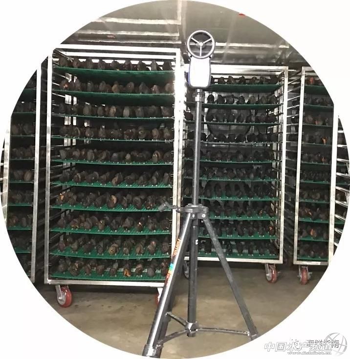 海參在架上定型后送入烘房烘干。這里的烘房采用最先進(jìn)的熱泵烘干,能全程自動(dòng)檢測(cè)海參水分減低速度,根據(jù)濕度變化調(diào)節(jié)烘房的溫度和風(fēng)速,確保海參在最適宜的溫度下烘干,控制海參的水分含量恒定不超過15%。這種自動(dòng)化控制保證海參成品的質(zhì)量恒定。