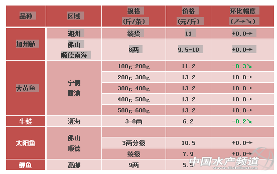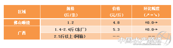 中國水產頻道獨家報道, 文/粵海飼料集團、水產前沿 彭曉君 叉尾𫚔 廣西區域:凍廠入廠檢測嚴格,要求無藥殘、白肉(無黃肉),走市場需求低,幾乎沒人開價收魚。目前存塘規格魚較多,價格低迷。今年叉尾養殖普遍受到打擊較大,預計明年這條魚的投苗和養殖會“遇冷”,部分客戶會選擇轉養黃顙、巴沙等品種。 泥鰍 其它品種 加州鱸:湖州鱸魚價格目前沒有太大的變化,7-8成大的鱸魚統貨11元/斤;佛山順德、南海加州病害爛身,爛嘴,出血,水霉,花身,部分諾卡氏,9兩大的10-10.2元/斤,較上周有價格有上漲。 大黃魚:寧德霞浦養殖魚規格主要為小魚(50g以下)及400g以上大魚。魚排各種規格大黃魚存魚量較多,價格持續低迷。本周小規格魚價格繼續下跌,跌幅較大,每斤下跌0.3-0.4元。 牛蛙:澄海牛蛙主要規格在3-7兩,中蛙價格相對較低。目前養戶主要考慮繼續養殖,市場中蛙銷售量少,市場價格同比上周下跌0.2-0.3元/斤。 鯽魚:市場存塘量多,供過于求,價格持續走低。 【關鍵字】:叉尾𫚔 塘頭價 水產養殖 |