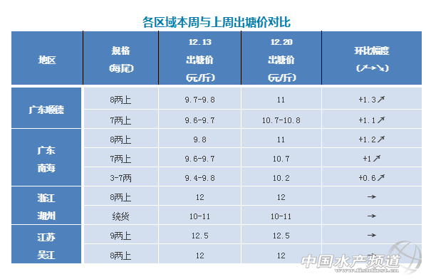 中國水產(chǎn)頻道獨家報道, 文/圖 杰大飼料、水產(chǎn)前沿李靜 聯(lián)合發(fā)布 各產(chǎn)區(qū)今日塘頭價及市場分析 廣東順德:今天報價6兩上10.5-10.6元/斤,7兩上10.7-10.8元/斤左右,8兩上11元/斤,比上周升幅超1元/斤!本周受冷空氣影響,外地過來的魚車收魚量增加。目前行情不錯,出魚開始有所增多,但以7兩、8兩上規(guī)格為主,北運車明顯較多。 廣東南海:6兩上10.5元/斤,7兩上10.7元/斤,8兩上11元/斤,本周升幅明顯。受魚價回升影響,本周出魚的養(yǎng)殖戶比上周有所增加,但大多都選擇出8兩上規(guī)格,6兩上規(guī)格目前已經(jīng)很少人出。在當?shù)厝媵~格的養(yǎng)殖戶也有所增加,3-7兩價價格在10.2元/斤左右,具體還是看原塘的魚頭和平均規(guī)格大小。 浙江湖州:今天8兩上規(guī)格12元/斤,統(tǒng)貨報價10-11元/斤。湖州地區(qū)目前選擇賣統(tǒng)貨的養(yǎng)殖戶比較多,近期魚價基本上比較穩(wěn)定。 江蘇吳江:吳江新口8兩報價為12元/斤,9兩報價12.5元/斤。目前吳江地區(qū)選擇賣統(tǒng)貨的比較少,按照目前的標魚價格,加上水溫較低,大部分養(yǎng)殖戶目前處于觀望狀態(tài),計劃到明年3月和4月份才開始出魚。 四川成都:今天報價格13元/斤,昨天下午9兩上規(guī)格有報價出13.5元/斤,今早養(yǎng)殖戶9兩上出13元/斤。近期有可能會升高,主要受廣東漲價影響。 湖北武漢:本周9兩上報價12-12.5元/斤,但這兩天報價以12.5元/斤為主,后市看好。 廣西南寧:1斤以上報價13-14元/斤,與上周相比上漲,預計后市價還有一定上漲空間。 本周水花200-230元/萬,與上周相比價格有所下降。目前絕大多數(shù)養(yǎng)殖戶還是覺得價格偏高,加上水溫低,所以放苗的人不多。 【關鍵字】:鱸魚 塘頭價 水產(chǎn)養(yǎng)殖 |