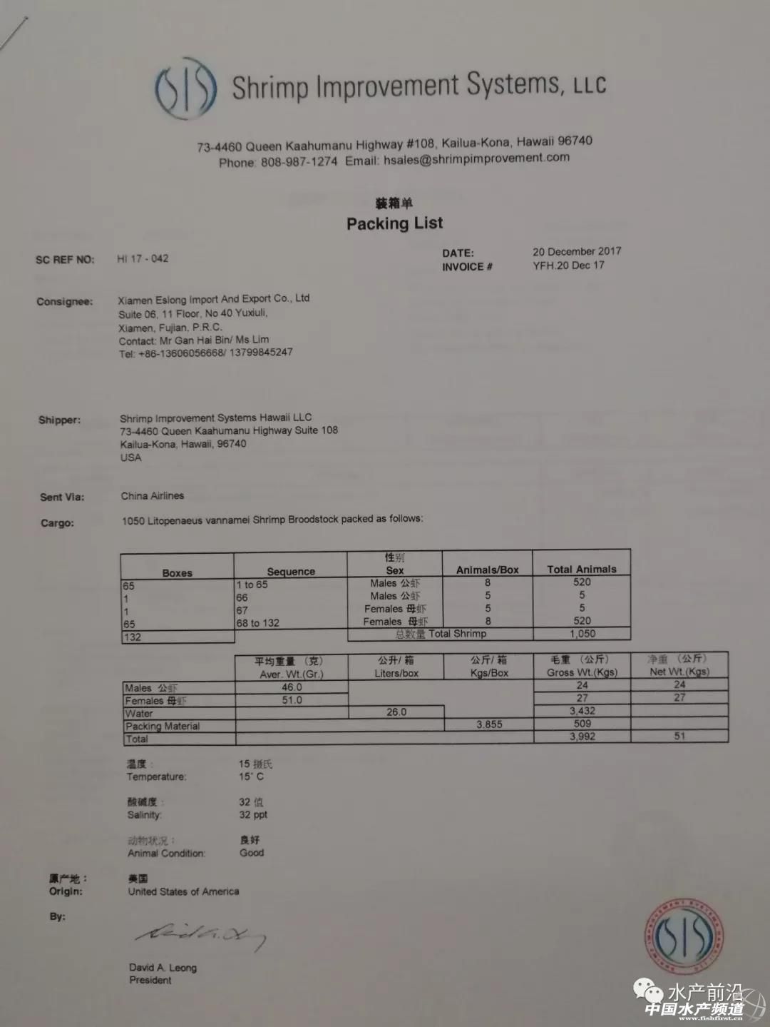 所以,這次讓養殖戶全程跟隨監督也是想告訴大家“金正龍”公司的合法性,讓養殖戶用自己的眼睛去確認這個事實。我們“金正龍”蝦苗是與美國SIS種蝦公司合作,從美國直接空運至國內。我們與SIS公司的合作文件、海關和農業部的檢疫文件全部都齊備,并在公司網站上展示給大家瀏覽。