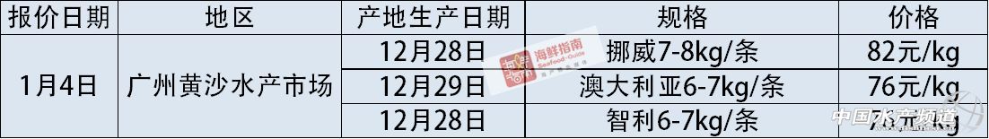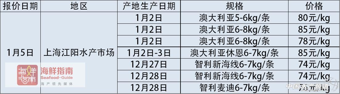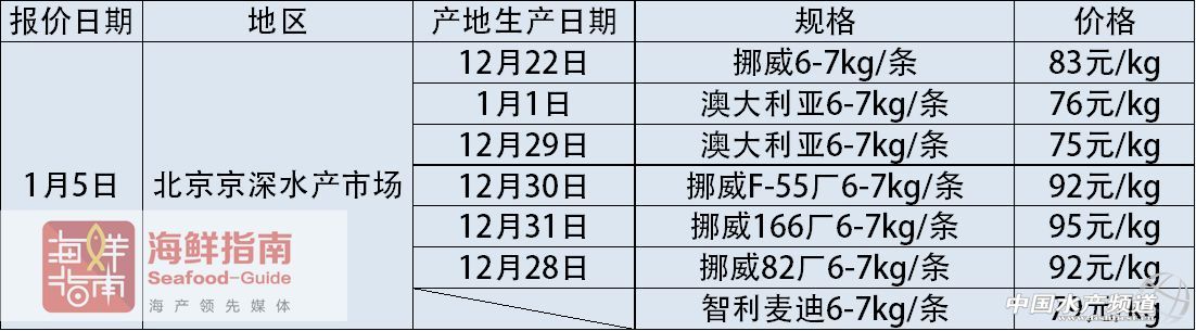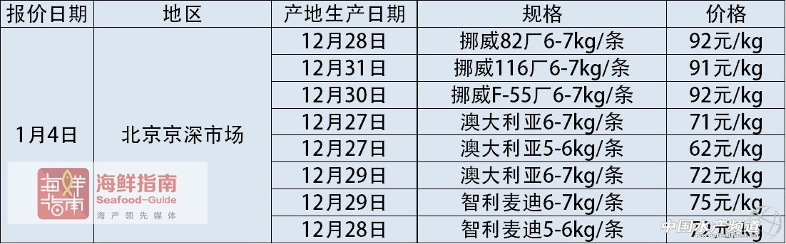 中國水產頻道獨家報道, 文/圖海鮮指南(seafood-guide)陳磊 國內主要海產市場大西洋鮭(三文魚)批發銷售價格 上周,挪威冰鮮三文魚通關問題依舊沒有得到解決,市場上流通的挪威冰鮮三文魚有明顯的減少,預計春節后才有可能緩解。同時澳大利亞的冰鮮三文魚有明顯的漲價,上海1月4日產6-8kg/條的價格已經賣到90元/公斤,少量的挪威冰鮮三文魚的價格也在90元/公斤以上。法羅群島的貨上周在市場的流通量偏少。 2018年1月7日: 2018年1月6日: 2018年1月5日: 2018年1月4日: 注明:以上價格為各地水產市場冰鮮三文魚(大西洋鮭)的市場批發銷售價格,非零售價格。產地生產日期表示:大西洋鮭從養殖場捕撈并加工完成的日期。大西洋鮭品牌中英文注釋:“澳大利亞休恩”即為:Huon;“澳大利亞塔斯爾”即為:Tassal;“智利新海線”即為:New World Currents;“智利麥迪”即為:Multierport Foods;“丹麥皇冠”即為:Bakkafrost;“SSF蘇格蘭”即為:Scottish Sea Farms;“挪威耕!奔礊椋篗arine Harvest。 《海鮮指南》編輯部三文魚報價欄目定期發布最新的市場行情和數據,為廣大海產人提供數據參考。如果你所在的市場有相關三文魚的報價信息或新聞可以提供,歡迎聯系:陳先生:18819465417(微信同號),郵箱:cl fishfirst.cn。 溫馨提示: 以上價格行情由“海鮮指南”統計整理發布,僅供參考。市場有風險,交易需謹慎。 【關鍵字】:三文魚 行情 報價 水產養殖 |