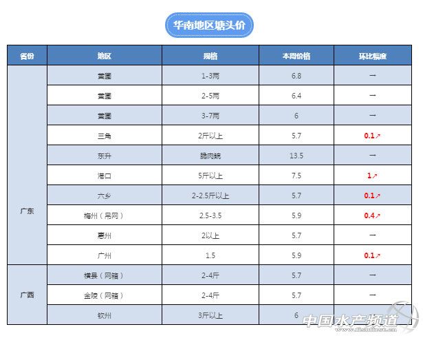 中國水產(chǎn)頻道獨家報道, 養(yǎng)得好,不如賣得好 全國草魚行情解析, 中國水產(chǎn)頻道與您相約每周二 文/水產(chǎn)前沿 鄭鵬飛 最近的這波冷空氣一路南下,結(jié)果遇上了溫暖潮濕的暖氣,各地的雨雪開始輪番上演。0℃線一路壓到江南南部至華南北部,一夜之間廣東氣溫下降10攝氏度,河南、山東以南大部分地區(qū)出現(xiàn)較長時間的低溫冰凍期。低溫、雨雪是對草魚行情極大的刺激,一方面是刺激消費,但更多的還是極大地減小了市場供給。最新一則幾百萬斤魚被堵高速超過30個小時的新聞受到廣泛關(guān)注。雨雪天不僅讓魚在流通過程中受到影響,而且大部分養(yǎng)殖戶也表示,天太冷,不愿意出魚。 寒冷冬天,魚價的上漲是對辛苦中的水產(chǎn)人最好的回報!據(jù)最新了解,目前草魚價格再一次被激活,各地普遍有漲價動作。其中湖北地區(qū)有3毛左右的上漲,湖南在平靜了很久之后本周也有2-3毛的上漲,江西贛州養(yǎng)殖戶反映1-3斤的草魚從上周的4.8元/斤漲到了現(xiàn)在的5.5元/斤,上漲了0.7元,漲幅近15%。目前華南地區(qū)大草魚非常少,有魚中表示“找不到大草魚”,大草魚行情有明顯上漲趨勢,后期有望進一步上漲。 華南地區(qū) 本周華南地區(qū)草魚價格有進一步上漲,其中以大草魚上漲最為明顯。目前5斤以上大草魚塘頭價7元/斤,上漲0.5元。黃圃的草魚種依然緊俏,草魚種和脆肉鯇價格維持上周水平。具體了解到,目前板芙地區(qū)的超市魚和統(tǒng)鯇上漲也是比較明顯,目前的塘頭價已經(jīng)漲到了5.8-6元/斤,據(jù)坦洲經(jīng)銷商表示,有客戶的超市鯇出到了6.1元。梅州興寧地區(qū)最近2-4斤的草魚報價5.8-6元/斤,4.5斤以上的賣到6元/斤。中山地區(qū)4斤以上的6.8元/斤,5斤以上的賣到7.5元/斤。佛山地區(qū)養(yǎng)殖戶表示,目前4斤以上的也是賣到了6.8元/斤。大涌3-7兩6元/斤,2-5兩6.5元/斤,超市魚5.8元/斤。 華中地區(qū) 上周有養(yǎng)殖戶表示,目前的價格已經(jīng)有所上漲,如果能夠下一場雪就錦上添花了。從結(jié)果看,中部地區(qū)很地方都迎來了難得一見的大雪,而且還是連續(xù)兩場雪。據(jù)最新了解,湖北鄂州地區(qū)雖然沒有下雪只是下了一點雪粒子,但是草魚價格依然有3毛的上漲,7斤以上的7元/斤,5斤以上的6.8元/斤;湖南也有2-3毛的上漲,目前2-3斤的塘頭價漲到了5.1-5.2元/斤。江西贛州1-3斤草魚從4.8元/斤漲到了5.5元/斤。 華東地區(qū) 本周華東地區(qū)降雪也是最為明顯,其中安徽、江蘇很多人的朋友圈都被美麗的雪景刷屏。本周安徽的草魚價格有小幅上漲,目前4斤左右的塘頭價5.3元/斤,浙江2-3斤的草魚漲幅明顯,較上周上漲了0.4元。福建地區(qū)大部分地區(qū)沒有下雪,但是降雨和寒潮依然影響巨大,草魚價格也整體都有上漲,目前2-4斤的草魚報價在5.8-6元/斤。 【關(guān)鍵字】:草魚 行情 水產(chǎn)養(yǎng)殖 |