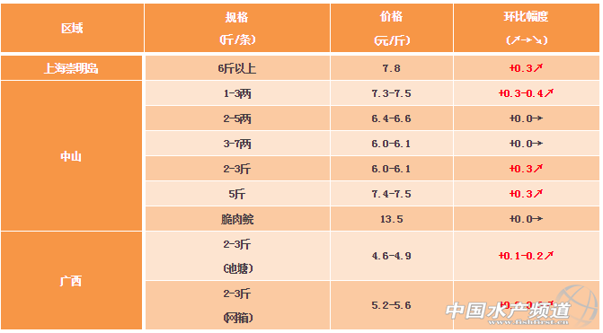 文/ 粵海飼料集團(tuán)、中國水產(chǎn)頻道 彭曉君 中國水產(chǎn)頻道原創(chuàng)報道,中山區(qū)域:小規(guī)格魚種價格上升處于高位,超市草魚近期市場銷量增加,價格上升,5斤以上存塘量少價格堅挺。氣溫下降,脆肉價格上升明顯。 上海區(qū)域:同比上周上漲,大草魚存塘量少,預(yù)期年前會去到8元/斤,主要因為蘇北地區(qū)存塘魚減少,氣溫低,拉動崇明島大草魚的需求。 廣西區(qū)域:天氣冷,消費市場打火鍋等習(xí)慣大草魚需求增長,加上氣溫低草魚的運輸范圍輻射廣,對草魚的出魚和銷售有所拉動。目前湖南、湖北等外地商客來廣西拉魚增多,拉動草魚價格有所增長。 ※上述報價可能會因區(qū)域、規(guī)格、品質(zhì)和時間等因素的不同而會產(chǎn)生差異,在此僅供參考。 |