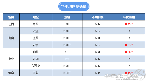 江西:本周江西地區草魚價格依然保持小幅上漲,目前1.3斤規格的草魚價格塘頭價為5.6-5.7元/斤,2.2斤以上的賣到了5.5元/斤。