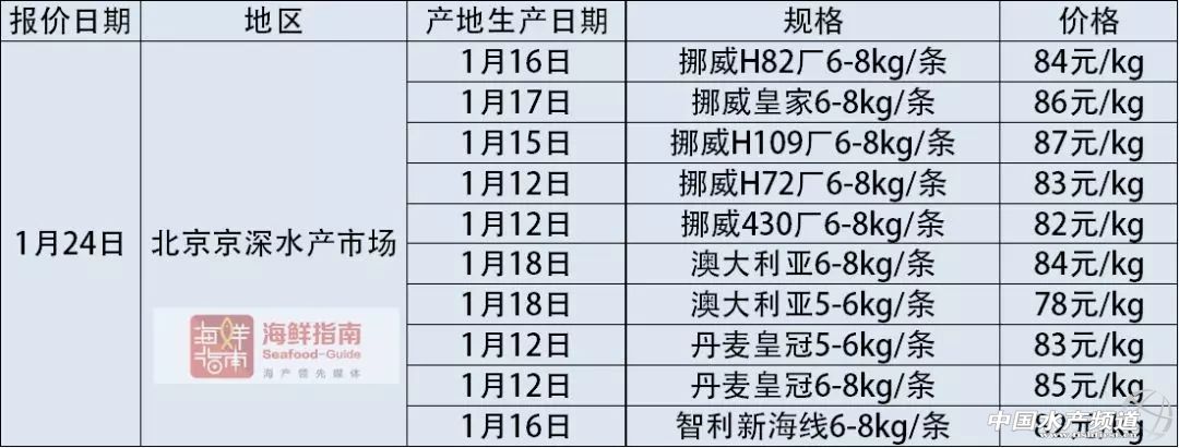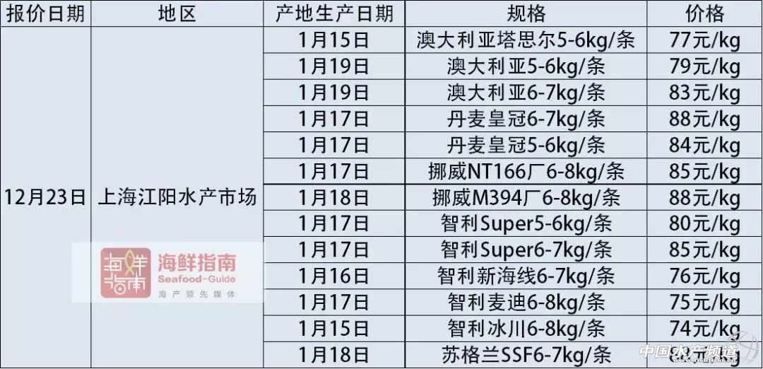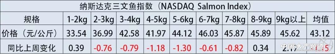 中國水產(chǎn)頻道獨家報道, 文/圖海鮮指南(seafood-guide)陳磊 納斯達克三文魚指數(shù) 注:納斯達克三文魚指數(shù)是挪威地區(qū)優(yōu)質(zhì)等級,帶頭去臟的冰鮮大西洋鮭出口價格指數(shù),此價格在一定程度上可以代表挪威當?shù)卮笪餮篚q的出口價格,是世界范圍內(nèi)公認的挪威大西洋鮭價格指數(shù)之一。匯率按2018年1月24日計算,1挪威克朗兌換0.8200人民幣。 本周(1月18日-1月24日),根據(jù)納斯達克三文魚指數(shù)顯示,挪威冰鮮三文魚各規(guī)格的原料均價下降了1.15元/公斤,上周均價已經(jīng)下降1.27元/公斤,這已經(jīng)是連續(xù)兩周均價有較大幅度的下跌。國內(nèi)常見規(guī)格5-6kg/條和6-7kg/條的大西洋鮭分別出現(xiàn)1.30元/公斤和0.61元/公斤的降幅,目前的價格分別為:44.12元/公斤和46.03元/公斤。1-2kg、8-9kg和9kg以上規(guī)格的價格有輕微漲幅。 國內(nèi)主要海產(chǎn)市場大西洋鮭(三文魚)批發(fā)銷售價格 2018年1月24日: 2018年1月23日: 注明:以上價格為各地水產(chǎn)市場冰鮮三文魚(大西洋鮭)的市場批發(fā)銷售價格,非零售價格。產(chǎn)地生產(chǎn)日期表示:大西洋鮭從養(yǎng)殖場捕撈并加工完成的日期。大西洋鮭品牌中英文注釋:“澳大利亞休恩”即為:Huon;“澳大利亞塔斯爾”即為:Tassal;“智利新海線”即為:New World Currents;“智利麥迪”即為:Multierport Foods;“丹麥皇冠”即為:Bakkafrost;“SSF蘇格蘭”即為:Scottish Sea Farms;“挪威耕海”即為:Marine Harvest。 【關(guān)鍵字】:水產(chǎn)養(yǎng)殖 |