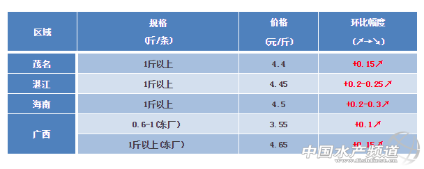 中國水產(chǎn)頻道獨家報道, 文/ 粵海飼料集團(tuán)、水產(chǎn)前沿 彭曉君 羅非魚 廣東地區(qū):茂名統(tǒng)賣3.9-4元/斤,湛江統(tǒng)賣4.1元/斤,海南統(tǒng)賣4.1-4.15元/斤。年前穩(wěn)中有升,年后小幅上漲。羅非魚大魚存塘量不多,寒潮來襲損耗大,出口加工廠部分啟動,春節(jié)將近訂單多。 廣西區(qū)域:由于羅非魚不耐寒,過冬魚存塘量較少,量少價漲,大規(guī)格羅非基本選擇走市場。由于天冷魚少,打火鍋習(xí)慣等影響,走市場活魚價格持續(xù)上升,走市場鮮活塘頭價1.2斤起5.5-5.8元/斤,比上周漲0.2-0.4元/斤! 溫馨提示:春節(jié)假期,2月每周六多品種魚蝦價暫停播報,3月恢復(fù)正常報價,感謝各位關(guān)注! 【關(guān)鍵字】:羅非魚 塘頭價 水產(chǎn)養(yǎng)殖 |