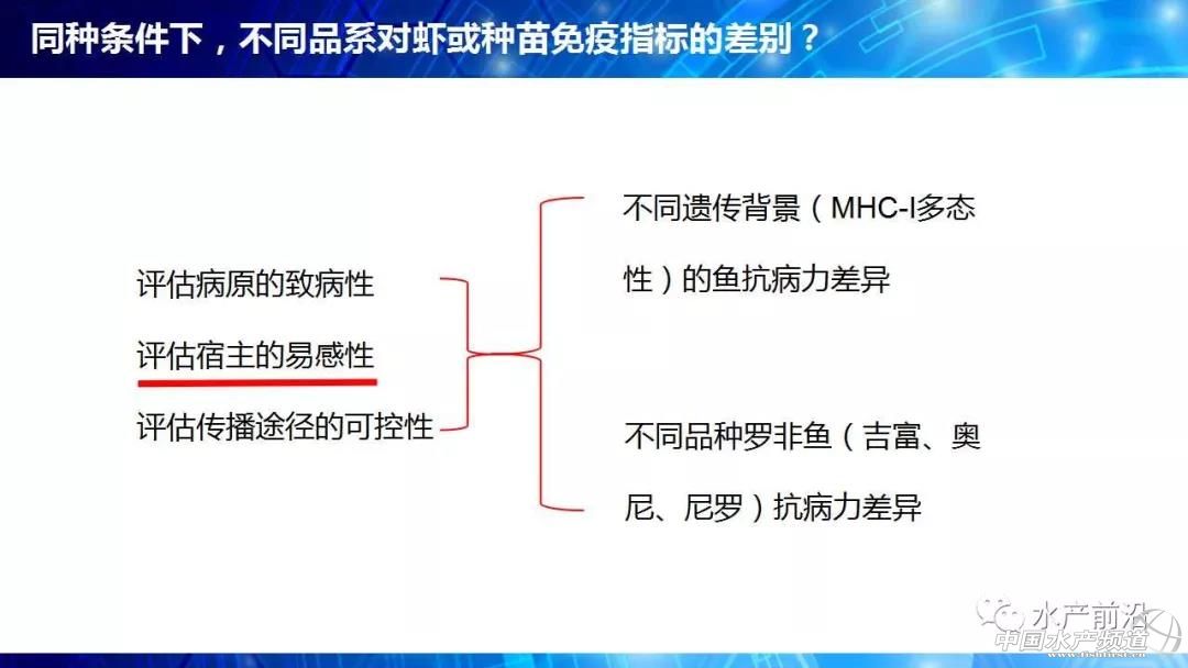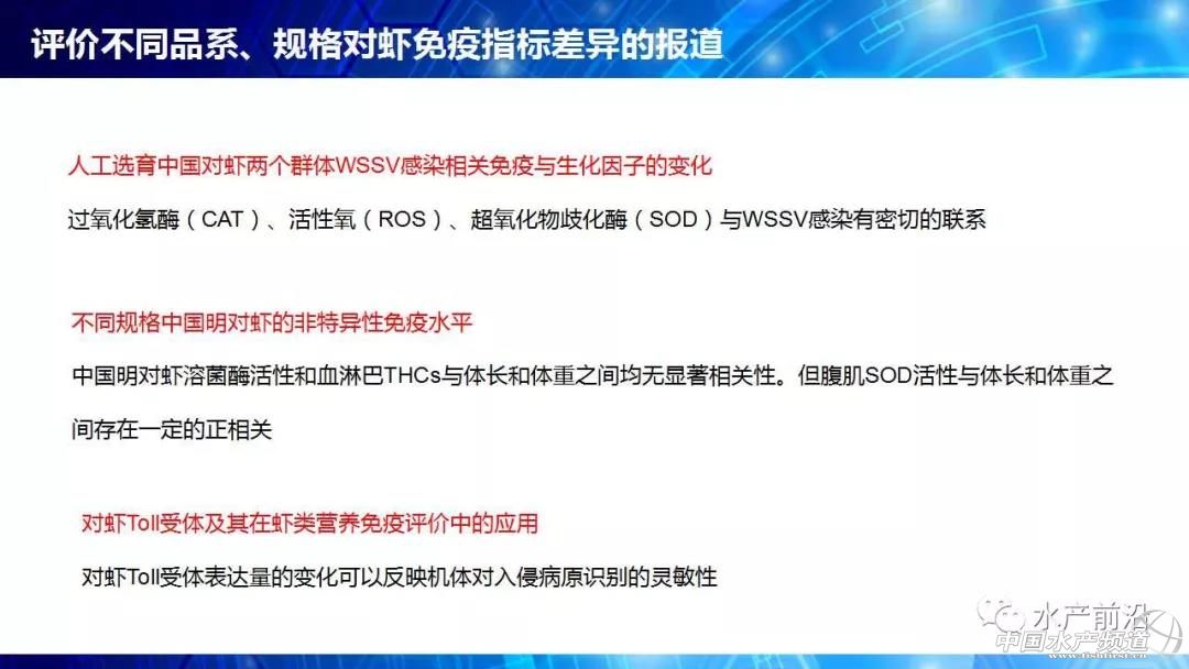 廣東海洋大學(xué) 魯義善教授 中國水產(chǎn)頻道原創(chuàng)報道,能不能養(yǎng)看種苗、養(yǎng)大養(yǎng)小看飼料、養(yǎng)好養(yǎng)壞看病害。會上,廣東海洋大學(xué)教授魯義善博士提出疑惑,長期以來,行業(yè)內(nèi)缺乏種苗健康評價標(biāo)準(zhǔn),僅靠種苗經(jīng)銷商的商業(yè)宣傳。那么,什么樣的種苗才是健康種苗?哪些指標(biāo)可以評價種苗的健康程度?對于這些問題卻一直沒有得到很好的解答。 由于業(yè)界內(nèi)對健康種苗的指標(biāo)并不明確,即使是簡單的SOD酶活力也有許多說法。所以行業(yè)需要推動種苗健康評價,內(nèi)容包括疫病檢測、抗病力評價和抗逆性評價。2011年,我國印發(fā)“農(nóng)業(yè)部關(guān)于印發(fā)《魚類產(chǎn)地檢疫規(guī)程(試行)》等3個規(guī)程的通知”,標(biāo)志著我國啟動了水產(chǎn)苗種產(chǎn)地檢疫工作。 對蝦病害越來越繁雜,相應(yīng)的檢測方法也相繼出現(xiàn)。研究人員也針對性的開展免疫力試驗(yàn),發(fā)現(xiàn)凡納濱對蝦各組織中免疫指標(biāo)隨亞硝酸鹽氮、總氨氮等濃度的轉(zhuǎn)變有很明顯變化。然而,免疫指標(biāo)評價抗病力,只是提供參考。必須有實(shí)際抗病力的反映,那就是人工感染。 開展種苗的健康評價,讓各種苗生產(chǎn)商的種苗“是騾子是馬牽出來遛遛”,不僅僅是一線養(yǎng)殖戶的需求,更是那些被“李鬼”害苦的正規(guī)種苗生產(chǎn)商的需求。未來,大數(shù)據(jù)將帶來健康評價的深入變革。 更多詳細(xì)內(nèi)容,請閱讀PPT內(nèi)容。至此,小編不再贅述,附上PPT原件供大家參考,請勿抄襲或盜用報告嘉賓的原創(chuàng)內(nèi)容,謝謝! |