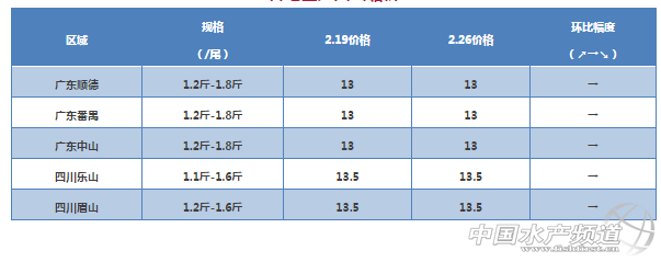 中國水產(chǎn)頻道獨(dú)家報(bào)道, 魚價(jià)穩(wěn)中有升,好行情能持續(xù)到元宵節(jié)嗎? 文/圖 何氏水產(chǎn)、水產(chǎn)前沿 李靜 江團(tuán) 1、江團(tuán)價(jià)格與上周持平。節(jié)后市場消費(fèi)疲軟,預(yù)估下周行情會(huì)有所浮動(dòng)。 2、四川江團(tuán)的價(jià)格保持不變。 各地區(qū)江團(tuán)出塘價(jià) 【關(guān)鍵字】:江團(tuán) 出塘價(jià) 水產(chǎn)養(yǎng)殖 |