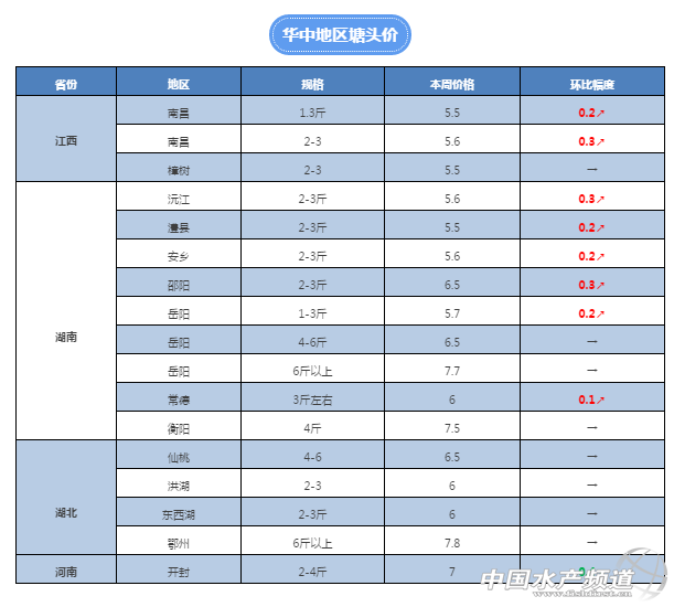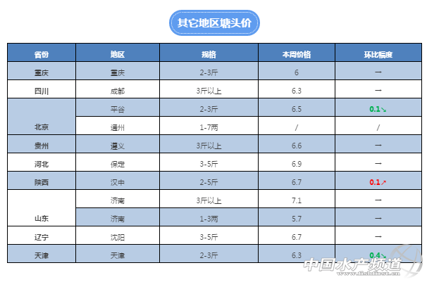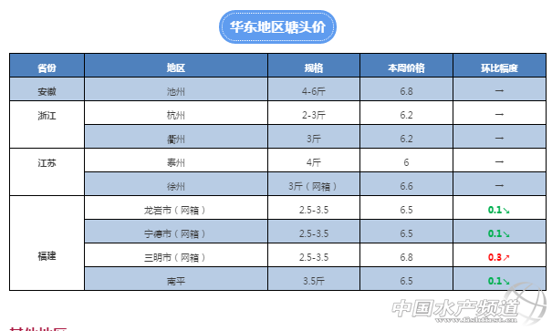 中國(guó)水產(chǎn)頻道獨(dú)家報(bào)道, 養(yǎng)得好,不如賣(mài)得好 全國(guó)草魚(yú)行情解析, 中國(guó)水產(chǎn)頻道與您相約每周二 文/圖 水產(chǎn)前沿 鄭鵬飛 春回大地,萬(wàn)物復(fù)蘇!本周大部分地區(qū)都是艷陽(yáng)高照的好天氣,隨著天氣逐漸回暖,草魚(yú)供應(yīng)趨向穩(wěn)定,價(jià)格行情整體穩(wěn)中有升。雖然局部地區(qū)仍然表現(xiàn)出行情波動(dòng),但是從整體上看,本周華南地區(qū)基本保持穩(wěn)定并有小幅上漲,北方地區(qū)價(jià)格有小幅回落。其中,廣西賀州地區(qū)2-4斤草魚(yú)從上周的6.5元/斤漲到了7元/斤,為本周漲幅最大;山東地區(qū)草魚(yú)苗上漲明顯,目前20尾/斤規(guī)格的已經(jīng)賣(mài)到7元/斤,比月初時(shí)的5.5元/斤有1.5元的上漲。 華南地區(qū) 佛山:最新了解到,佛山地區(qū)超市鯇塘頭價(jià)6.5元/斤,3斤以上的7元/斤,6斤的草魚(yú)8.6元/斤,8斤的8.8元/斤。 肇慶:肇慶地區(qū)統(tǒng)鯇塘頭報(bào)價(jià)6.7-6.8元/斤,較上周的7元/斤有0.2-0.3元的回落。 廣州:番禺地區(qū)目前2斤左右的6.6元/斤,較上周繼續(xù)上漲0.1元,5斤左右的塘頭價(jià)8元/斤。了解到,海鷗島1斤以上羅非價(jià)格再次上漲0.3元,目前已經(jīng)賣(mài)到6.3元/斤,增城2斤左右的塘頭價(jià)已經(jīng)賣(mài)到了6.7元/斤。 梅州:有養(yǎng)殖戶反映,目前梅州地區(qū)2斤以上草魚(yú)已經(jīng)賣(mài)到8元/斤,較上周上漲0.3元。 中山:目前中山脆肉鯇由于存貨不多,賣(mài)魚(yú)火熱,正是一年中魚(yú)中最忙的時(shí)候。脆肉鯇價(jià)格行情繼續(xù)維持在上周的水平,13斤以上的塘頭價(jià)14.5元/斤。目前坦洲地區(qū)3斤以上草魚(yú)的7元/斤,4斤起的7.6元/斤,5斤起的已經(jīng)賣(mài)到了8.1元/斤,6斤起的目前塘頭價(jià)8.8-9元/斤,超市鯇維持6.5元/斤。板芙地區(qū)統(tǒng)鯇6.5-6.6元/斤,超市鯇6.3元/斤。 江門(mén):本周江門(mén)地區(qū)草魚(yú)價(jià)格整體保持穩(wěn)定,部分地區(qū)有0.2元左右的下滑。目前鶴山地區(qū)3斤的塘頭價(jià)7.3元/斤,維持穩(wěn)定,而5斤以塘頭價(jià)7.8元/斤,較上周有0.2元的下滑。江門(mén)新會(huì)地區(qū)統(tǒng)鯇塘頭價(jià)6.5元/斤,維持穩(wěn)定。 貴港:廣西地區(qū)的草魚(yú)價(jià)格整體上維持穩(wěn)定,2-4斤塘頭價(jià)穩(wěn)定在6.1-6.5元/斤之間。貴港地區(qū)價(jià)格穩(wěn)定在上周水平,塘頭價(jià)6元/斤。 南寧、桂林:廣西南寧地區(qū)草魚(yú)價(jià)格維持穩(wěn)定,目前2-4斤草魚(yú)塘頭價(jià)為6.4元/斤,廣西桂林地區(qū)草魚(yú)塘頭價(jià)穩(wěn)定在6.3元/斤。 賀州:正如之前我們所預(yù)測(cè)的,廣西地區(qū)統(tǒng)鯇一定能突破7元/斤。目前賀州地區(qū)2-3斤草魚(yú)塘頭價(jià)已經(jīng)漲到了7元/斤,再次上漲0.5元,為本周漲幅最大地區(qū)。 華中地區(qū) 江西:本周江西南昌地區(qū)2斤左右的草魚(yú)塘頭價(jià)漲到了5.6-5.8元/斤,較上周有0.3-0.5元的上漲,養(yǎng)殖戶對(duì)目前的價(jià)格還是比較滿意。目前江西樟樹(shù)地區(qū)草魚(yú)不是很好賣(mài),塘頭價(jià)維持在5.5.元/斤。 湖南:湖南益陽(yáng)地區(qū)2-4斤草魚(yú)目前塘頭價(jià)穩(wěn)定在5.6-5.8元之間,較上周有小幅上漲。湖南邵陽(yáng)地區(qū)草魚(yú)價(jià)格維持穩(wěn)定,常德地區(qū)草魚(yú)價(jià)格有小幅上漲,岳陽(yáng)地區(qū)3斤左右的塘頭價(jià)6.5元/斤,較上周有小幅上漲。湘陰地區(qū)2斤左右草魚(yú)價(jià)格有下降趨勢(shì),養(yǎng)殖戶不太想賣(mài)。 湖北:了解到,本周湖北地區(qū)草魚(yú)行情整體保持穩(wěn)定,目前鄂州地區(qū)2斤左右的塘頭價(jià)維持6元/斤,近期沒(méi)有太大波動(dòng)。 河南:由于上周價(jià)格波動(dòng)較大,本周開(kāi)封地區(qū)2-4斤草魚(yú)塘頭價(jià)從上周的7元/斤回落到6.6元/斤。 華東地區(qū) 江蘇:了解到本周江蘇地區(qū)草魚(yú)價(jià)格有小幅下滑,其中徐州地區(qū)草魚(yú)價(jià)格有0.2元左右的下滑,江蘇南通地區(qū)草魚(yú)價(jià)格也是有小幅下滑,目前4斤以上的6.6元/斤,5斤起的6.9元/斤。 福建:福建三明地區(qū)目前3斤左右草魚(yú)的報(bào)價(jià)為6.8元/斤,相比上周有0.3元的上漲。福建南平地區(qū)草魚(yú)下滑趨勢(shì)有所減緩,較上周有0.1元左右的下滑,目前3斤左右的草魚(yú)塘頭價(jià)6.5元/斤。 安徽:本周安徽地區(qū)草魚(yú)價(jià)格沒(méi)有太大波動(dòng),基本維持在上周水平。 重慶:了解到目前墊江地區(qū)本地的成魚(yú)不多,2-4斤的草魚(yú)塘頭價(jià)穩(wěn)定在6.5元/斤。銅梁地區(qū)草魚(yú)價(jià)格整體維持上周水平,養(yǎng)殖戶反映目前的價(jià)格不是很穩(wěn)定,暫時(shí)還存在波動(dòng)。 天津:本周天津地區(qū)的草魚(yú)行情較上周有0.3-0.5元的下滑,目前2.5斤以上的草魚(yú)塘頭價(jià)在6.2-6.4元/斤之間,平均報(bào)價(jià)6.3元/斤。 四川:目前廣元地區(qū)的草魚(yú)價(jià)格穩(wěn)定在上周水平,塘頭價(jià)7元/斤。德陽(yáng)地區(qū)3斤左右的草魚(yú)目前塘頭價(jià)6.5元/斤,自貢地區(qū)塘頭價(jià)維持6元/斤。 遼寧:目前遼寧沈陽(yáng)地區(qū)2.5斤左右草魚(yú)塘頭價(jià)6.3元/斤,3-5斤的6.7元/斤,維持上周水平。了解到,目前沈陽(yáng)地區(qū)小草魚(yú)價(jià)格相對(duì)穩(wěn)定,成魚(yú)價(jià)格有小幅下滑。 陜西: