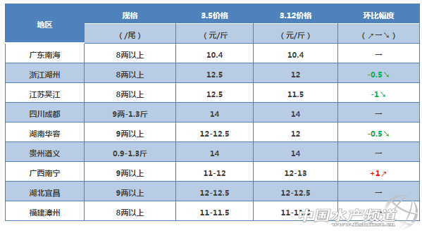 中國(guó)水產(chǎn)頻道獨(dú)家報(bào)道, 小伙伴們都驚呆了!桂魚、生魚漲幅超乎想象! 文/圖 何氏水產(chǎn)、水產(chǎn)前沿 李靜 加州鱸 1.上周價(jià)格鱸魚保持平穩(wěn)。 2.這周開塘8兩以上規(guī)格的價(jià)格是10.4元/斤,以這個(gè)規(guī)格為主打,1成大魚便宜0.2元/斤,以此類推,6兩多清塘的魚也開始出塘。預(yù)估下周行情變化不大。 3.其他地區(qū)情況:廣西南寧價(jià)格上漲了1元/斤;江蘇吳江下跌了1元/斤;浙江湖州、湖南華容價(jià)格下調(diào)了0.5元/斤。 各地區(qū)加州鱸出塘價(jià) 【關(guān)鍵字】:加州鱸魚 價(jià)格 水產(chǎn)養(yǎng)殖 |