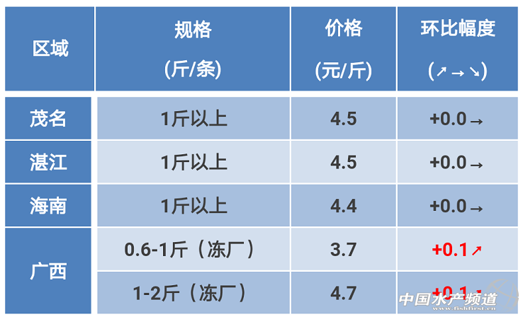 文/ 粵海飼料集團、中國水產頻道 彭曉君 中國水產頻道原創獨家報道,粵西區域:粵西天氣好轉,養殖戶加強投料,爭取在4月份達規格出魚。現存塘大魚較少,判斷近期會有0.2元左右的波動。 海南區域:目前工廠還未全面開工,魚價還是維持節前的價格,預計工廠報價還是不會變動,會維持一段時間。 廣西區域:過冬魚少,凍廠開工較少,凍廠價有小漲。目前羅非基本以走市場為主,1.2斤起報價5.3-5.5元/斤。 ※上述報價可能會因區域、規格、品質和時間等因素的不同而會產生差異,在此僅供參考。 【關鍵字】:羅非魚 羅非魚價格 水產養殖 |